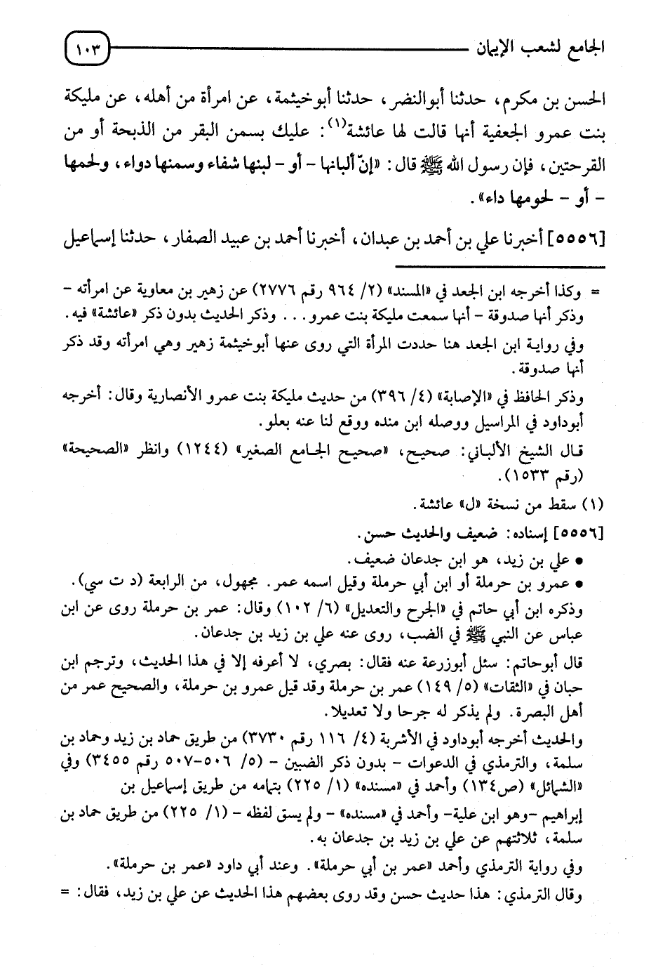 5556 - أَخْبَرَنَا عَلِيُّ بْنُ أَحْمَدَ بْنِ عَبْدَانَ، أَنَا أَحْمَدُ بْنُ عُبَيْدٍ الصَّفَارُ، ثَنَا إِسْمَاعِيلُ -[104]- بْنُ إِسْحَاقَ، ثَنَا سُلَيْمَانُ بْنُ حَرْبٍ، ثَنَا حَمَّادُ بْنُ زَيْدٍ، عَنْ عَلِيِّ بْنِ زَيْدٍ، عَنْ عَمْرِو بْنِ حَرْمَلَةَ، عَنِ ابْنِ عَبَّاسٍ قَالَ: كُنْتُ فِي بَيْتِ خَالَتِي مَيْمُونَةَ، فَجَاءَ النَّبِيُّ صَلَّى اللَّهُ عَلَيْهِ وَسَلَّمَ، وَمَعَهُ خَالِدُ بْنُ الْوَلِيدِ قَالَتْ لَهُ مَيْمُونَةُ: أَلَا نُطْعِمَكَ مِمَّا أَهْدَتْ لَنَا أُمُّ عَتِيقٍ، فَجِيءَ بِضَبَّيْنِ مَشْوِيَّيْنِ عَلَى ثُمَامَةٍ، فَلَمَّا رَآهَا رَسُولُ اللهِ صَلَّى اللَّهُ عَلَيْهِ وَسَلَّمَ بَزَقَ، فَقَالَ خَالِدٌ: أَرَاكَ يَا رَسُولَ اللهِ تَقْذُرُهُ قَالَ: " أَجَلْ " ثُمَّ أُتِيَ رَسُولُ اللهِ صَلَّى اللَّهُ عَلَيْهِ وَسَلَّمَ بِلَبَنٍ فَشَرِبَ، وَأَنَا عَنْ يَمِينِهِ، وَخَالِدٌ، عَنْ يَسَارِهِ فَقَالَ: أَنْتَ أَحَقُّ بِشُرْبِهِ، فَهَلْ أَنْتَ مُؤْثِرٌ بِهَا خَالِدًا؟ قَالَ: قُلْتُ: مَا أُحِبُّ أَنْ أُوثِرَ بِسُؤْرِكَ أَحَدًا فَشَرِبْتُ، ثُمَّ أَتَى خَالِدٌ بِشَرَابٍ، فَشَرِبَ فَقَالَ رَسُولُ اللهِ صَلَّى اللَّهُ عَلَيْهِ وَسَلَّمَ: " §إِذَا أَكَلَ أَحَدُكُمْ طَعَامًا: فَلْيَقُلِ: اللهُمَّ بَارِكْ لَنَا فِيهِ، وَأَبْدِلْنَا خَيْرًا مِنْهُ، وَإِذَا شَرِبَ لَبَنًا فَلْيَقُلِ: اللهُمَّ بَارِكْ لَنَا فِيهِ، وَزِدْنَا مِنْهُ، فَإِنَّهُ لَيْسَ شَيْءٌ يَجْرِي مَجْرَى الطَّعَامِ وَالشَّرَابِ إِلَّا اللَّبَنُ "