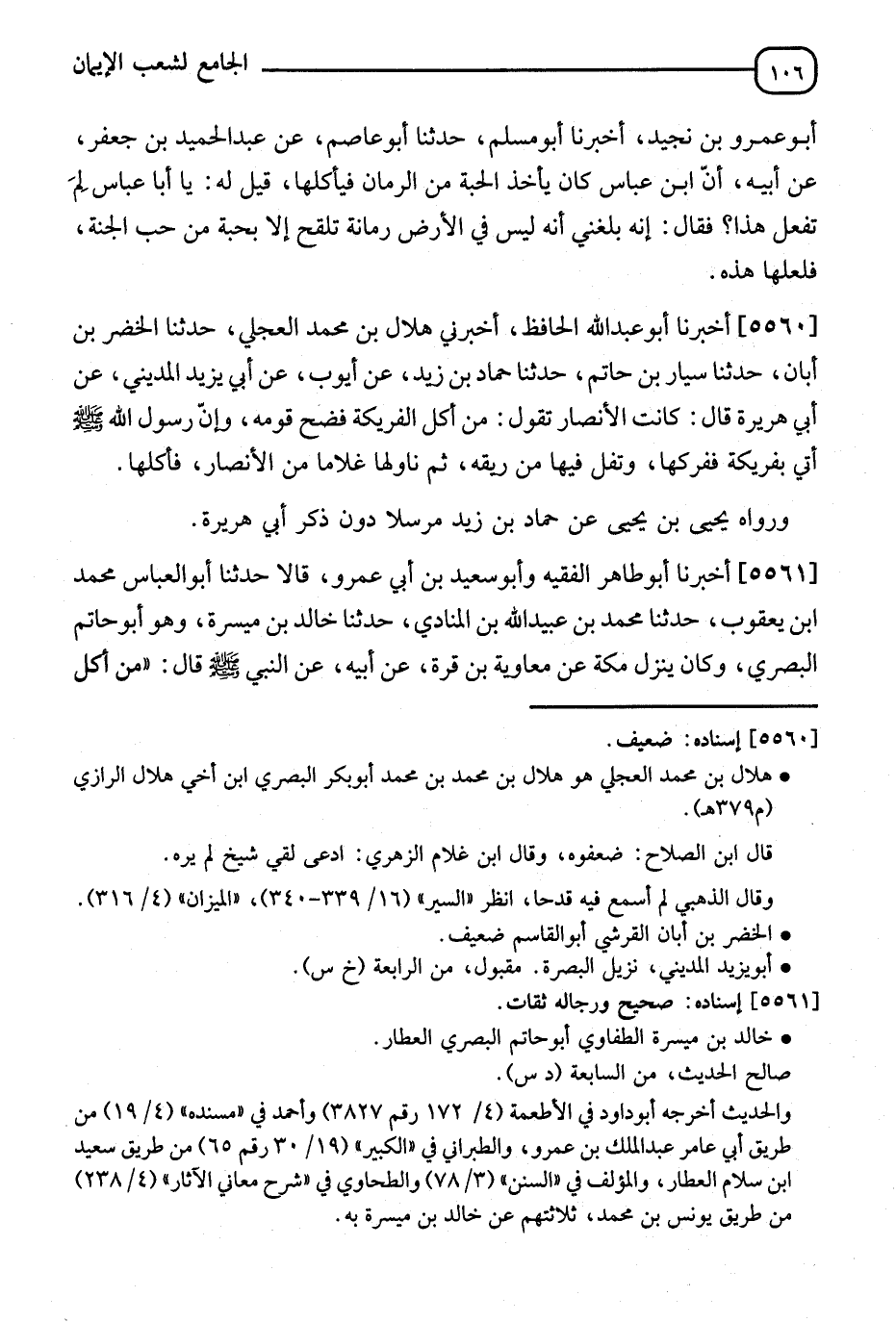 5560 - أَخْبَرَنَا أَبُو عَبْدِ اللهِ الْحَافِظُ، أَخْبَرَنِي هِلَالُ بْنُ مُحَمَّدٍ الْعِجْلِيُّ، ثَنَا الْخَضِرُ بْنُ أَبَانَ، ثَنَا سَيَّارُ بْنُ حَاتِمٍ، ثَنَا حَمَّادُ بْنُ زَيْدٍ، عَنْ أَيُّوبَ، عَنْ أَبِي يَزِيدَ الْمَدِينِيِّ، عَنْ أَبِي هُرَيْرَةَ قَالَ: كَانَتِ الْأَنْصَارُ تَقُولُ: مَنْ أَكَلَ الْفَرِيكَةَ فَضَحَ قَوْمَهُ: " وَإِنَّ رَسُولَ اللهِ صَلَّى اللَّهُ عَلَيْهِ وَسَلَّمَ §أُتِيَ بِفَرِيكٍ، فَفَرَكَهَا وَتَفَلَ فِيهَا مِنْ رِيقِهِ، ثُمَّ نَاوَلَهَا غُلَامًا مِنَ الْأَنْصَارِ، فَأَكَلَهَا " وَرَوَاهُ يَحْيَى بْنُ يَحْيَى، عَنْ حَمَّادِ بْنِ زَيْدٍ، مُرْسَلًا دُونَ ذِكْرِ أَبِي هُرَيْرَةَ
