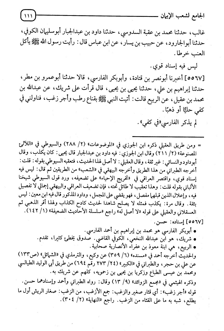5567 - أَخْبَرَنَا أَبُو نَصْرِ بْنُ قَتَادَةَ، وَأَبُو بَكْرٍ الْفَارِسِيُّ قَالَا: ثَنَا أَبُو عَمْرِو بْنُ مَطَرٍ، ثَنَا إِبْرَاهِيمُ بْنُ عَلِيٍّ، ثَنَا يَحْيَى بْنُ يَحْيَى قَالَ: قَرَأْتُ عَلَى شَرِيكٍ، عَنْ عَبْدِ اللهِ بْنِ مُحَمَّدِ بْنِ عُقَيْلٍ، عَنِ الرَّبِيعِ قَالَ: " §أَتَيْتُ النَّبِيَّ صَلَّى اللَّهُ عَلَيْهِ وَسَلَّمَ بِقِنَاعِ رُطَبٍ، وَأَجْرٍ زُغْبٍ، فَنَاوَلَنِي فِي كَفِّي حُلِيًّا أَوْ ذَهَبًا، لَمْ يَذْكُرِ الْفَارِسِيُّ فِي كَفِّي "