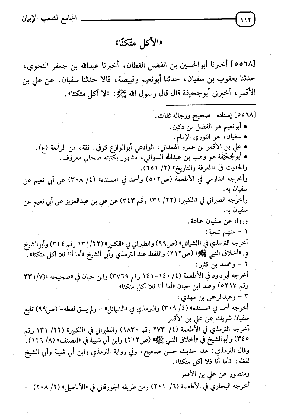 5568 - أَخْبَرَنَا أَبُو الْحُسَيْنِ بْنُ الْفَضْلِ الْقَطَّانُ، أَنَا عَبْدُ اللهِ بْنُ جَعْفَرٍ النَّحْوِيُّ، ثَنَا يَعْقُوبُ بْنُ سُفْيَانَ، ثَنَا أَبُو نُعَيْمٍ، وَقَبِيصَةُ قَالَا: ثَنَا سُفْيَانُ، عَنْ عَلِيِّ بْنِ الْأَقْمَرِ، أَخْبَرَنِي أَبُو جُحَيْفَةَ قَالَ: قَالَ رَسُولُ اللهِ صَلَّى اللَّهُ عَلَيْهِ وَسَلَّمَ: " §لَا آكُلُ مُتَّكِئًا " -[113]-