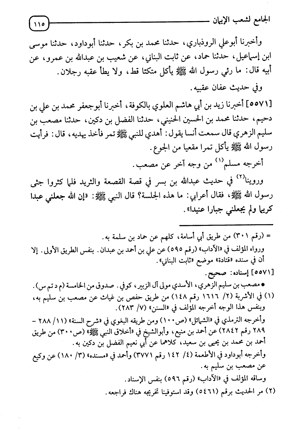 5571 - أَخْبَرَنَا زَيْدُ بْنُ أَبِي هَاشِمٍ الْعَلَوِيُّ، بِالْكُوفَةِ، ثَنَا أَبُو جَعْفَرٍ مُحَمَّدُ بْنُ عَلِيِّ بْنِ دُحَيْمٍ، ثَنَا مُحَمَّدُ بْنُ الْحُسَيْنِ الْحُنَيْنِيُّ، ثَنَا الْفَضْلُ بْنُ دُكَيْنٍ، ثَنَا مُصْعَبُ بْنُ سُلَيْمٍ الزُّهْرِيُّ قَالَ: سَمِعْتُ أَنَسًا يَقُولُ: " أُهْدِيَ لِلنَّبِيِّ صَلَّى اللَّهُ عَلَيْهِ وَسَلَّمَ تَمْرٌ فَأَخَذَ يُهْدِيهِ قَالَ: فَرَأَيْتُ رَسُولَ اللهِ صَلَّى اللَّهُ عَلَيْهِ وَسَلَّمَ §يَأْكُلُ تَمْرًا مُقْعِيًا مِنَ الْجُوعِ " أَخْرَجَهُ مُسْلِمٌ مِنْ وَجْهٍ آخَرَ، عَنْ مُصْعَبٍ.
