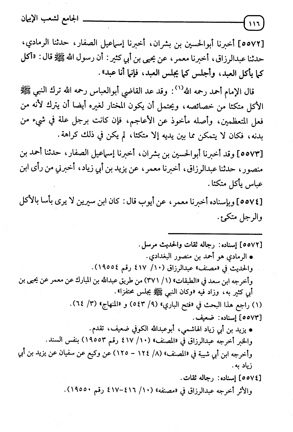 5572 - أَخْبَرَنَا أَبُو الْحُسَيْنِ بْنُ بِشْرَانَ، أَنَا إِسْمَاعِيلُ الصَّفَارُ، ثَنَا الرَّمَادِيُّ، ثَنَا عَبْدُ الرَّزَّاقِ، أَنَا مَعْمَرٌ، عَنْ يَحْيَى بْنِ أَبِي كَثِيرٍ، أَنَّ رَسُولَ اللهِ صَلَّى اللَّهُ عَلَيْهِ وَسَلَّمَ قَالَ: " §آكُلُ كَمَا يَأْكُلُ الْعَبْدُ، وَأَجْلِسُ كَمَا يَجْلِسُ الْعَبْدُ فَإِنَّمَا أَنَا عَبْدٌ " قَالَ الْإِمَامُ أَحْمَدُ رَحِمَهُ اللهُ: " وَقَدْ عُدَّ الْقَاضِي أَبُو الْعَبَّاسِ رَحِمَهُ اللهُ: تَرَكَ النَّبِيُّ صَلَّى اللَّهُ عَلَيْهِ وَسَلَّمَ الْأَكْلَ مُتَّكِئًا مِنْ خَصَائِصِهِ وَيُحْتَمَلُ أَنْ يَكُونَ الْمُخْتَارُ لِغَيْرِهِ أَيْضًا أَنْ يَتْرُكَ لِأَنَّهُ مِنْ فِعْلِ الْمُتَعَظِّمِينَ وَأَصْلُهُ مَأْخُوذٌ عَنِ الْأَعَاجِمِ فَإِنْ كَانَتْ بِرَجُلٍ عِلَّةٌ فِي شَيْءٍ مِنْ بَدَنِهِ وَكَانَ لَا يَتَمَكَّنُ مِمَّا بَيْنَ يَدَيْهِ إِلَّا مُتَّكِئًا لَمْ يَكُنْ فِي ذَلِكَ كَرَاهِيَةٌ "