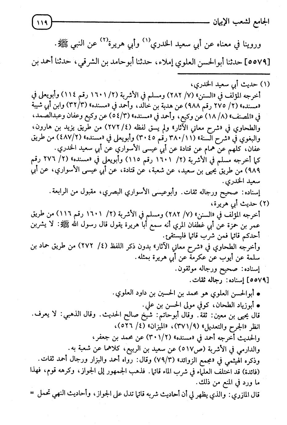 5579 - حَدَّثَنَا أَبُو الْحَسَنِ الْعَلَوِيُّ، إِمْلَاءً ثَنَا أَبُو حَامِدِ بْنُ الشَّرْقِيِّ، ثَنَا أَحْمَدُ بْنُ -[120]- سَعِيدٍ الدَّارِمِيُّ، ثَنَا بَكْرُ بْنُ بَكَّارٍ، ثَنَا شُعْبَةُ، عَنْ أَبِي زِيَادٍ الطَّحَّانُ، مَوْلَى الْحَسَنِ بْنِ عَلِيٍّ قَالَ: سَمِعْتُ أَبَا هُرَيْرَةَ يَقُولُ: رَأَى رَسُولُ اللهِ صَلَّى اللَّهُ عَلَيْهِ وَسَلَّمَ رَجُلًا يَشْرَبُ قَائِمًا فَقَالَ: " §أَيَسُرُّكُ أَنْ يَشْرَبَ مَعَكَ الْهِرُّ؟ " قَالَ: لَا، فَقَالَ رَسُولُ اللهِ صَلَّى اللَّهُ عَلَيْهِ وَسَلَّمَ: " قَدْ شَرِبَ مَعَكَ الشَّيْطَانُ فِي مَا شَرِبْتَ " -[121]- قَالَ الْإِمَامُ أَحْمَدُ رَحِمَهُ اللهُ: " يُحْتَمَلُ أَنْ يَكُونَ النَّهْيُ عَنِ الشَّرَابِ قَائِمًا عَلَى الْإِحْسَانِ وَالْأَدَبِ فِي الشُّرْبِ قَاعِدًا أَوْ لِمَا فِيهِ مِنَ الدَّاءِ فِيمَا زَعَمَ أَهْلُ الطِّبِّ وَخُصُوصًا لِمَنْ كَانَتْ فِي أَسَافِلِهِ عِلَّةٌ يَشْكُوهَا مِنْ بَرْدٍ أَوْ رُطُوبَةٍ لَا عَلَى التَّحْرِيمِ فَقَدْ "