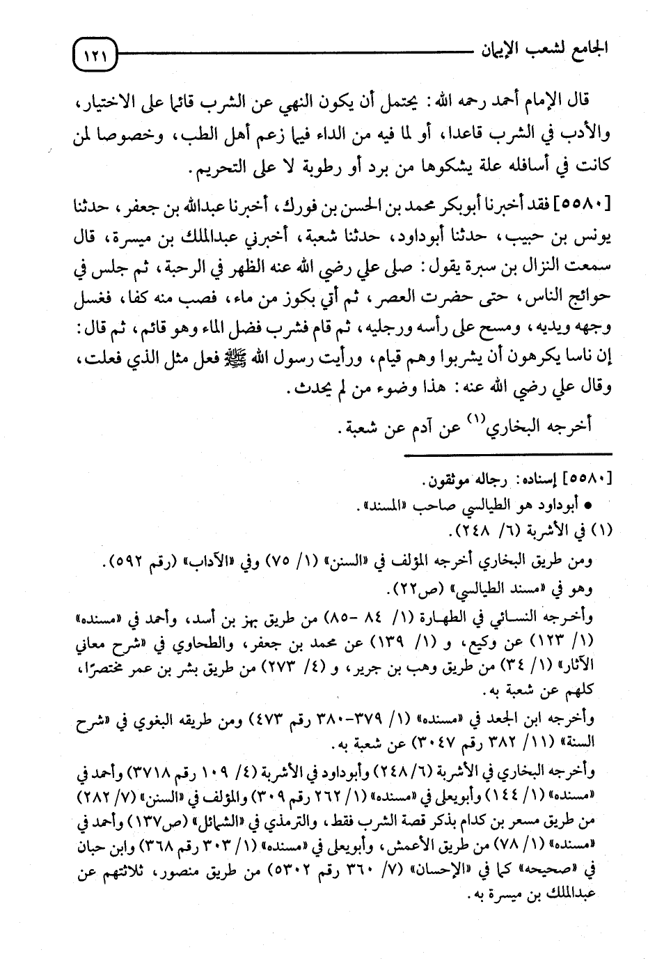 5580 - أَخْبَرَنَا أَبُو بَكْرٍ مُحَمَّدُ بْنُ الْحَسَنِ بْنِ فُورَكٍ، أَنَا عَبْدُ اللهِ بْنُ جَعْفَرٍ، ثَنَا يُونُسُ بْنُ حَبِيبٍ، ثَنَا أَبُو دَاوُدَ، ثَنَا شُعْبَةُ، أَخْبَرَنِي عَبْدُ الْمَلِكِ بْنُ مَيْسَرَةَ قَالَ: سَمِعْتُ النَّزَّالَ بْنَ سَبْرَةَ يَقُولُ: صَلَّى عَلِيٌّ رَضِيَ اللهُ عَنْهُ الظُّهْرَ فِي الرَّحْبَةِ ثُمَّ جَلَسَ فِي حَوَائِجِ النَّاسِ حَتَّى حَضَرَتِ الْعَصْرُ، ثُمَّ أُتِيَ بِكُوزٍ مِنْ مَاءٍ فَصَبَّ مِنْهُ كَفًّا، فَغَسَلَ وَجْهَهُ وَيَدَيْهِ وَمَسَحَ عَلَى رَأْسِهِ وَرِجْلَيْهِ، ثُمَّ قَامَ فَشَرِبَ فَضْلَ الْمَاءِ وَهُوَ قَائِمٌ ثُمَّ قَالَ: " إِنَّ §نَاسًا يَكْرَهُونَ أَنْ يَشْرَبُوا وَهُمْ قِيَامٌ وَرَأَيْتُ رَسُولَ اللهِ صَلَّى اللَّهُ عَلَيْهِ وَسَلَّمَ فَعَلَ مِثْلَ الَّذِي فَعَلْتُ " وَقَالَ عَلِيٌّ رَضِيَ اللهُ عَنْهُ: " هَذَا وَضُوءُ مَنْ لَمْ يُحَدِثْ " أَخْرَجَهُ الْبُخَارِيُّ، عَنْ آدَمَ، عَنْ شُعْبَةَ