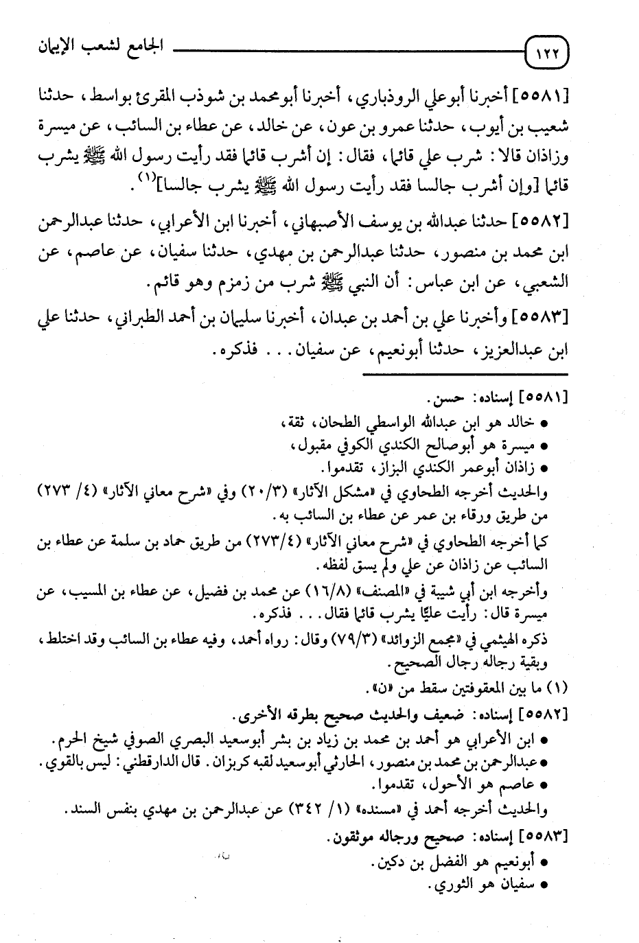 5582 - حَدَّثَنَا عَبْدُ اللهِ بْنُ يُوسُفَ الْأَصْبَهَانِيُّ، أَنَا ابْنُ الْأَعْرَابِيِّ، ثَنَا عَبْدُ الرَّحْمَنِ بْنُ مُحَمَّدِ بْنِ مَنْصُورٍ، ثَنَا عَبْدُ الرَّحْمَنِ بْنُ مَهْدِيٍّ، ثَنَا سُفْيَانُ، عَنْ عَاصِمٍ، عَنِ الشَّعْبِيِّ، عَنِ ابْنِ عَبَّاسٍ، " أَنَّ النَّبِيَّ صَلَّى اللَّهُ عَلَيْهِ وَسَلَّمَ §شَرِبَ مِنْ زَمْزَمَ وَهُوَ قَائِمٌ "