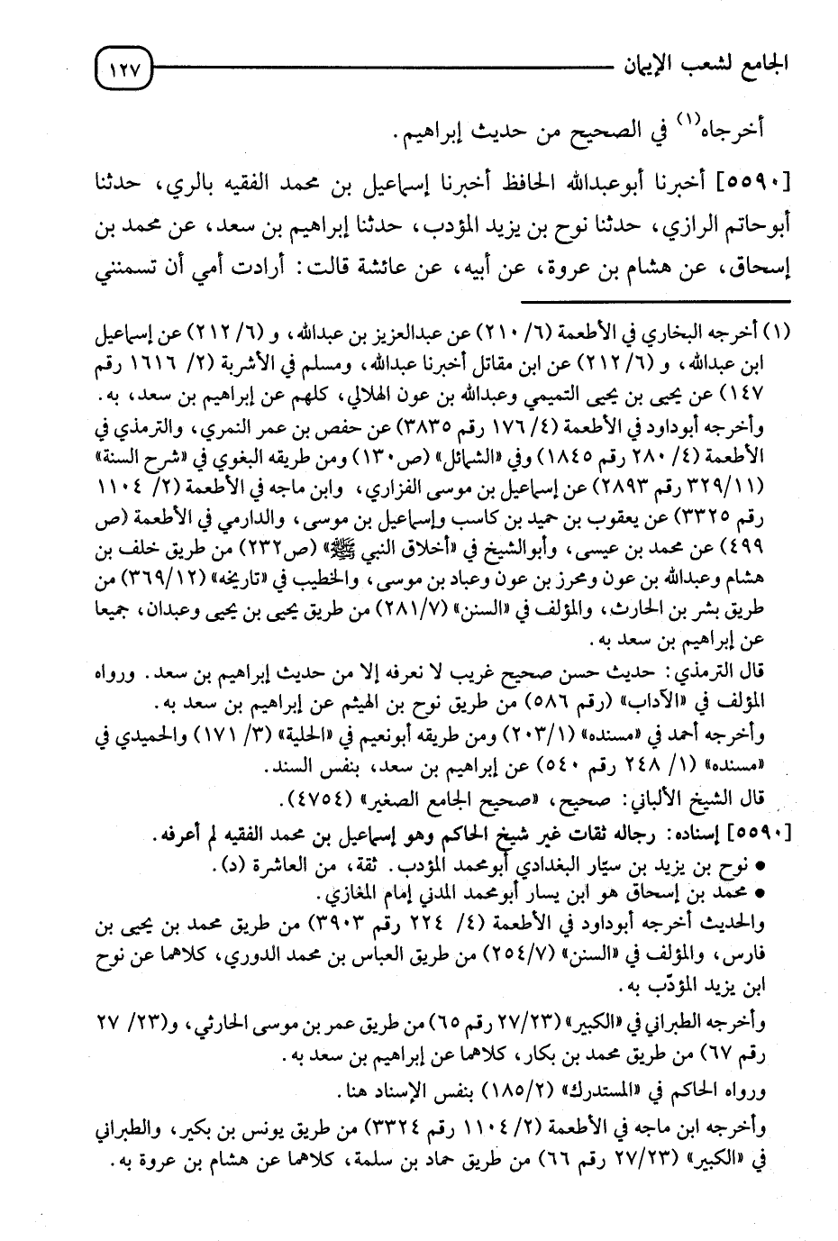 5590 - أَخْبَرَنَا أَبُو عَبْدِ اللهِ الْحَافِظُ، أَنَا إِسْمَاعِيلُ بْنُ مُحَمَّدٍ الْفَقِيهُ، بِالرِّيِّ ثَنَا أَبُو حَاتِمٍ الرَّازِيُّ، ثَنَا نُوحُ بْنُ يَزِيدَ الْمُؤَدِّبُ، ثَنَا إِبْرَاهِيمُ بْنُ سَعْدٍ، عَنْ مُحَمَّدِ بْنِ إِسْحَاقَ، عَنْ هِشَامِ بْنِ عُرْوَةَ، عَنْ أَبِيهِ، عَنْ عَائِشَةَ قَالَتْ: §" أَرَادَتْ أُمِّي لِتُسَمِّنَنِي -[128]- لِدُخُولِي عَلَى رَسُولِ اللهِ صَلَّى اللَّهُ عَلَيْهِ وَسَلَّمَ فَلَمْ أُقْبِلْ عَلَيْهَا بِشَيْءٍ مِمَّا تُرِيدُ حَتَّى أَطْعَمَتْنِي الْقِثَّاءَ بِالرُّطَبِ فَسَمِنْتُ عَلَيْهِ كَأَحْسَنِ السِّمَنِ "