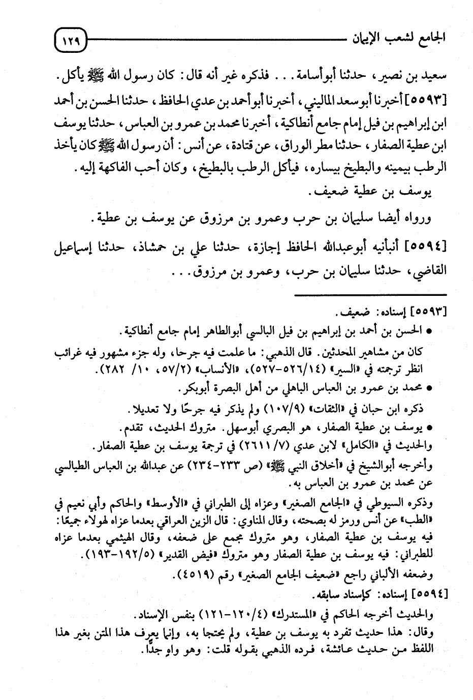 5593 - أَخْبَرَنَا أَبُو سَعْدٍ الْمَالِينِيُّ، أَنَا أَبُو أَحْمَدُ بْنُ عَدِيٍّ، ثَنَا الْحَسَنُ بْنُ أَحْمَدَ بْنِ إِبْرَاهِيمَ بْنِ صَلٍّ، إِمَامُ جَامِعِ أَنْطَاكِيَّةَ، أَنَا مُحَمَّدُ بْنُ عَمْرِو بْنِ الْعَبَّاسِ، ثَنَا يُوسُفُ بْنُ عَطِيَّةَ الصَّفَارُ، ثَنَا مَطَرٌ الْوَرَّاقُ، عَنْ قَتَادَةَ، عَنْ أَنَسٍ: " أَنَّ رَسُولِ اللهِ صَلَّى اللَّهُ عَلَيْهِ وَسَلَّمَ كَانَ §يَأْخُذُ الرُّطَبَ بِيَمِينِهِ وَالْبِطِّيخَ بِيَسَارِهِ، فَيَأْكُلُ الرُّطَبَ بِالْبِطِّيخِ وَكَانَ أَحَبُّ الْفَاكِهَةِ إِلَيْهِ " يُوسُفَ بْنَ عَطِيَّةَ ضَعِيفٌ، وَرَوَاهُ أَيْضًا سُلَيْمَانُ بْنُ حَرْبٍ وَعَمْرُو بْنُ مَرْزُوقٍ، عَنْ يُوسُفَ بْنِ عَطِيَّةَ،