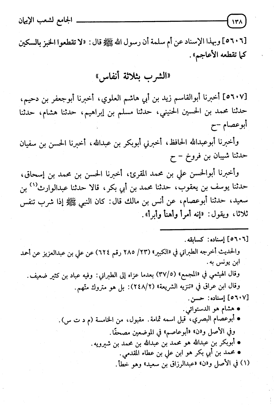 5607 - أَخْبَرَنَا أَبُو الْقَاسِمِ زَيْدُ بْنُ أَبِي هَاشِمٍ الْعَلَوِيُّ، أَنَا أَبُو جَعْفَرِ بْنُ دُحَيْمٍ، ثَنَا مُحَمَّدُ بْنُ الْحُسَيْنِ الْحُنَيْنِيُّ، ثَنَا مُسْلِمُ بْنُ إِبْرَاهِيمَ، ثَنَا هِشَامٌ، ثَنَا أَبُو عَاصِمٍ، ح وَأَخْبَرَنَا أَبُو عَبْدِ اللهِ الْحَافِظُ، أَخْبَرَنِي أَبُو بَكْرِ بْنُ عَبْدِ اللهِ، أَنَا الْحَسَنُ بْنُ سُفْيَانَ، ثَنَا شَيْبَانُ بْنُ فَرُّوخَ، وَأَخْبَرَنَا أَبُو الْحَسَنِ عَلِيُّ بْنُ مُحَمَّدٍ الْمُقْرِئُ أَنَا الْحَسَنُ بْنُ مُحَمَّدِ بْنِ إِسْحَاقَ، ثَنَا يُوسُفُ بْنُ يَعْقُوبَ، ثَنَا مُحَمَّدُ بْنُ أَبِي بَكْرٍ قَالَا: ثَنَا عَبْدُ الرَّزَّاقِ بْنُ سَعِيدٍ، ثَنَا أَبُو عَاصِمٍ، عَنْ أَنَسِ بْنِ مَالِكٍ قَالَ: كَانَ النَّبِيُّ صَلَّى اللَّهُ عَلَيْهِ وَسَلَّمَ إِذَا شَرِبَ تَنَفَّسَ ثَلَاثًا، وَيَقُولُ: " إِنَّهُ §أَمْرَأُ وَأَهْنَأُ وَأَبْرَأُ " -[139]- لَفْظُ حَدِيثِ الْمُقْرِئِ