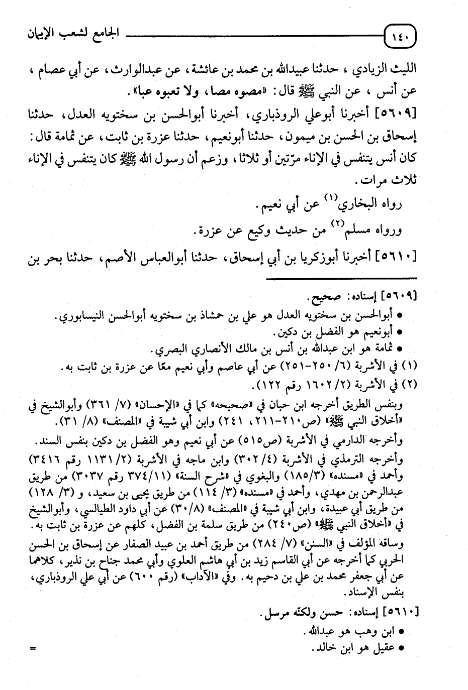 5609 - أَخْبَرَنَا أَبُو عَلِيٍّ الرُّوذْبَارِيُّ، أَنَا أَبُو الْحَسَنِ بْنُ سَخْتُوَيْهِ الْعَدْلُ، ثَنَا إِسْحَاقُ بْنُ الْحَسَنِ بْنِ مَيْمُونٍ، ثَنَا أَبُو نُعَيْمٍ، ثَنَا عَزْرَةُ بْنُ ثَابِتٍ، عَنْ ثُمَامَةَ قَالَ: " كَانَ أَنَسُ §يَتَنَفَّسُ فِي الْإِنَاءِ مَرَّتَيْنِ أَوْ ثَلَاثًا، وَزَعَمَ أَنَّ رَسُولَ اللهِ صَلَّى اللَّهُ عَلَيْهِ وَسَلَّمَ كَانَ يَتَنَفَّسُ فِي الْإِنَاءِ ثَلَاثَ مَرَّاتٍ " رَوَاهُ الْبُخَارِيُّ، عَنْ أَبِي نُعَيْمٍ وَرَوَاهُ مُسْلِمٌ مِنْ حَدِيثِ وَكِيعٍ، عَنْ عُرْوَةَ
