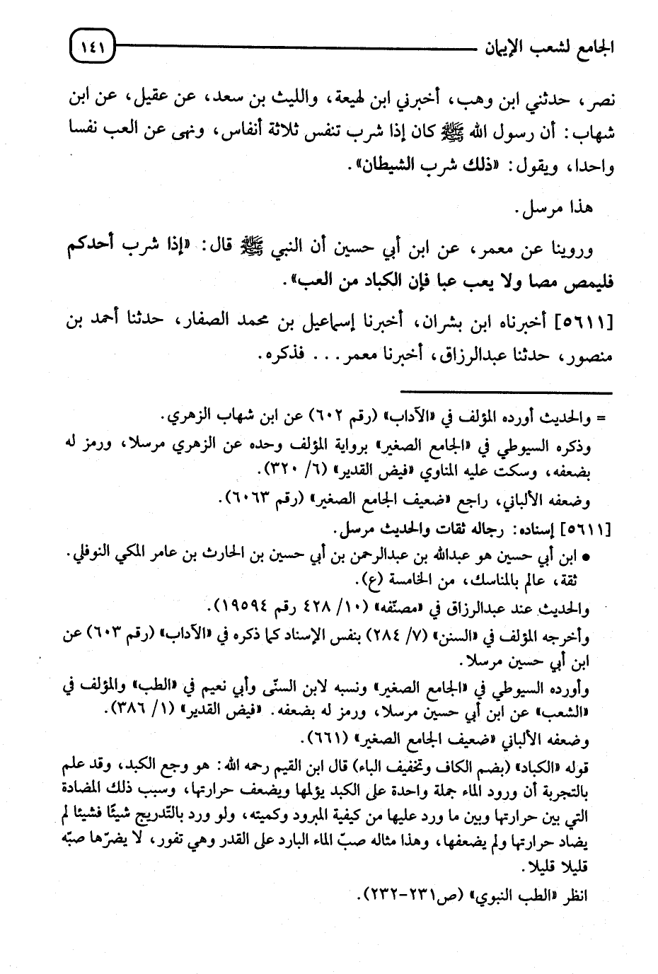 وَرُوِّينَا عَنْ مَعْمَرٍ، عَنِ ابْنِ أَبِي حُسَيْنٍ أَنَّ النَّبِيَّ صَلَّى اللَّهُ عَلَيْهِ وَسَلَّمَ قَالَ: " إِذَا §شَرِبَ أَحَدُكُمْ فَلْيَمُصَّ مَصًّا وَلَا يَغُبُّ غَبًّا فَإِنَّ الْكُبَادَ مِنَ الْغَبِّ "