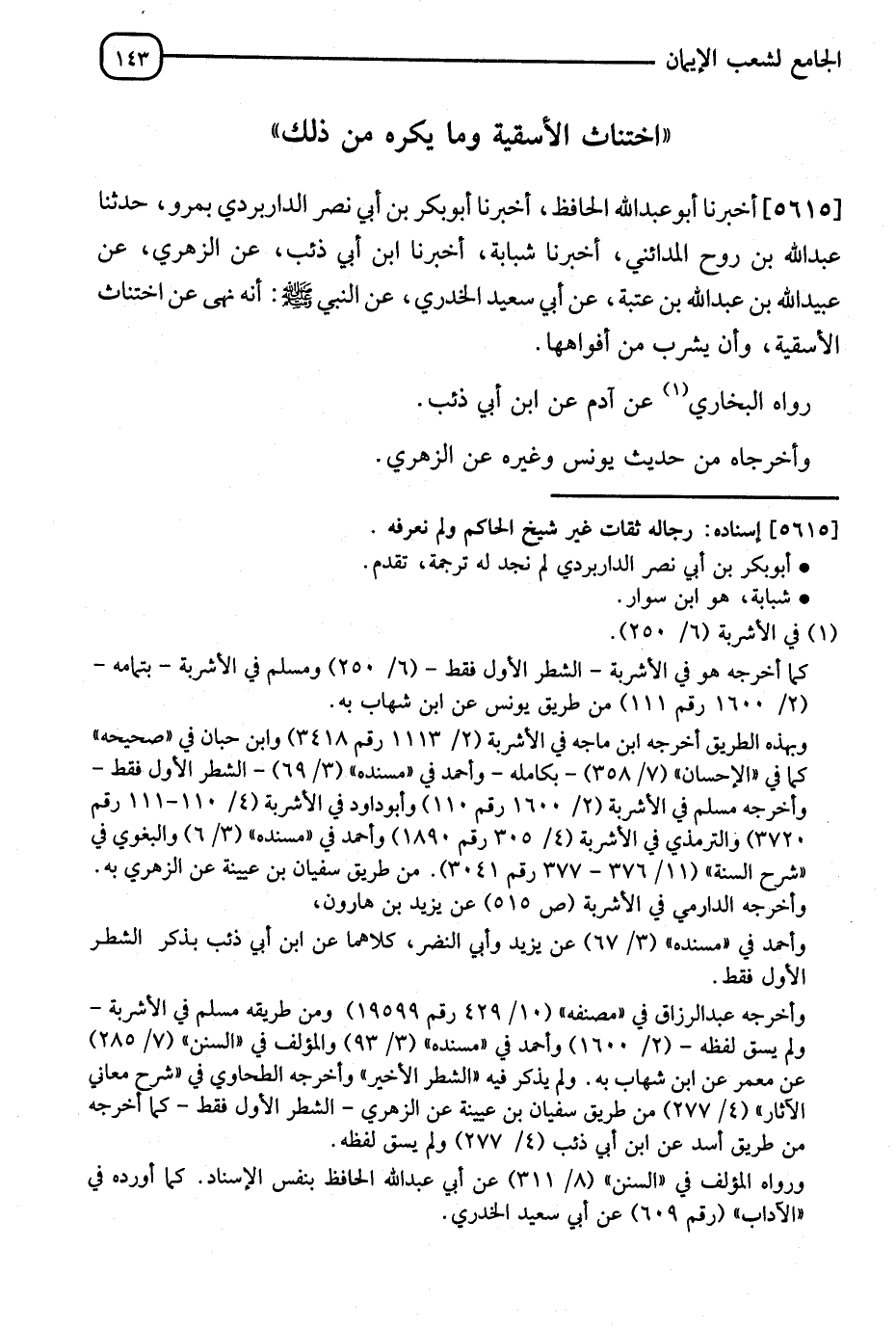 5615 - أَخْبَرَنَا أَبُو عَبْدِ اللهِ الْحَافِظُ، أَنَا أَبُو بَكْرِ بْنُ أَبِي نَصْرٍ الدَّرَاوَرْدِيُّ، بِمَرْوٍ ثَنَا عَبْدُ بْنُ رَوْحٍ الْمَدَائِنِيُّ، أَنَا شَبَابَةُ، أَنَا ابْنُ أَبِي ذِئْبٍ، عَنِ الزُّهْرِيِّ، عَنْ عُبَيْدِ اللهِ بْنِ عَبْدِ اللهِ بْنِ عُتْبَةَ، عَنْ أَبِي سَعِيدٍ الْخُدْرِيِّ عَنِ النَّبِيِّ صَلَّى اللَّهُ عَلَيْهِ وَسَلَّمَ أَنَّهُ: §" نَهَى عَنِ اخْتِنَاثِ الْأَسْقِيَةِ وَأَنْ يُشْرَبَ مِنْ أَفْوَاهِهَا " رَوَاهُ الْبُخَارِيُّ، عَنْ آدَمَ، عَنِ ابْنِ أَبِي ذِئْبٍ. وَأَخْرَجَهُ مِنْ حَدِيثِ يُونُسَ وَغَيْرُهُ، عَنِ الزُّهْرِيِّ. -[144]- قَالَ الْإِمَامُ أَحْمَدُ: " وَإِنَّمَا هُوَ عِنْدَنَا، عَنْ يَزِيدَ بْنِ هَارُونَ، عَنْ إِسْمَاعِيلَ الْمَكِّيِّ، عَنِ الزُّهْرِيِّ. بِإِسْنَادِهِ قَالَ: شَرِبَ رَجُلٌ مِنْ فَمِ سِقَاءٍ فَانْسَابَ فِي بَطْنِهِ جَانٌّ فَنَهَى رَسُولُ اللهِ صَلَّى اللَّهُ عَلَيْهِ وَسَلَّمَ، عَنِ اخْتِنَاثِ الْأَسْقِيَةِ "