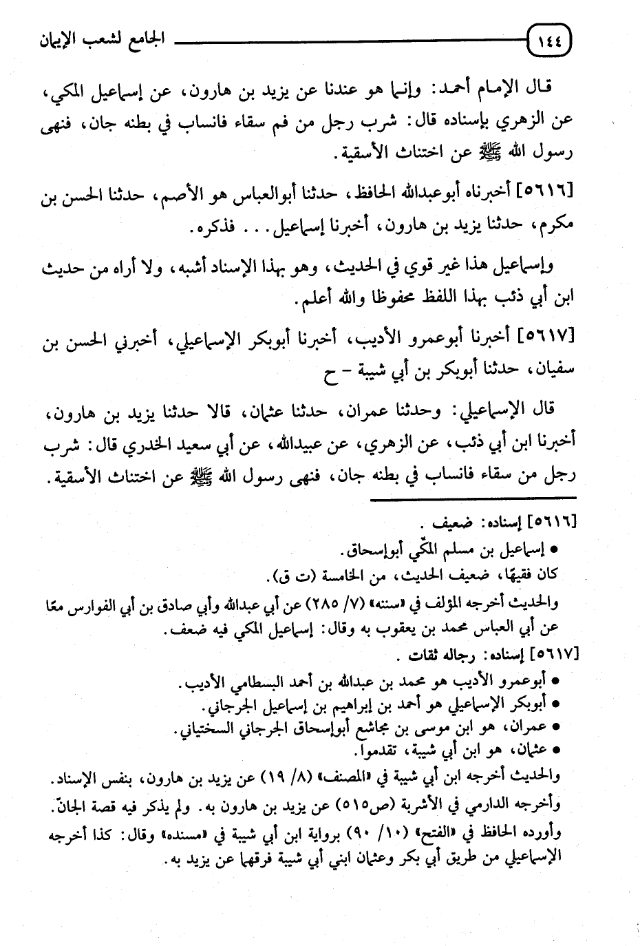5617 - أَخْبَرَنَا أَبُو عَمْرٍو الْأَدِيبُ، أَنَا أَبُو بَكْرٍ الْإِسْمَاعِيلِيُّ، أَخْبَرَنِي الْحَسَنُ بْنُ سُفْيَانَ، ثَنَا أَبُو بَكْرِ بْنُ أَبِي شَيْبَةَ، قَالَ: الْإِسْمَاعِيلِيُّ، وَثَنًا عِمْرَانُ، ثَنَا عُثْمَانُ، قَالَا: ثَنَا يَزِيدُ بْنُ هَارُونَ، أَنَا ابْنُ أَبِي ذِئْبٍ، عَنِ الزُّهْرِيِّ، عَنْ عُبَيْدِ اللهِ، عَنْ أَبِي سَعِيدٍ الْخُدْرِيِّ قَالَ: " §شَرِبَ رَجُلٌ مِنْ سِقَاءٍ فَانْسَابَ فِي بَطْنِهِ جَانٌّ، فَنَهَى رَسُولُ اللهِ صَلَّى اللَّهُ عَلَيْهِ وَسَلَّمَ عَنِ اخْتِنَاثِ الْأَسْقِيَةِ " " -[145]- كَذَا وَجَدْتُهُ فِي كِتَابِ الْإِسْمَاعِيلِيِّ وَهُوَ بِهَذَا اللَّفْظِ مِنْ حَدِيثِ ابْنِ أَبِي ذِئْبٍ غَرِيبٌ وَإِنَّمَا هُوَ عِنْدَنَا، عَنْ يَزِيدَ بْنِ هَارُونَ ". وَرَوَاهُ قُرَّةُ بْنُ عَبْدِ الرَّحْمَنِ، عَنِ ابْنِ شِهَابٍ الزُّهْرِيِّ دُونَ قِصَّةِ الْجَانِّ وَقَالَ فِي لَفْظِهِ: نَهَى رَسُولُ اللهِ صَلَّى اللَّهُ عَلَيْهِ وَسَلَّمَ عَنِ الشُّرْبِ مِنْ ثَلْمَةِ الْقَدَحِ وَأَنْ يُنْفَخَ فِي الشَّرَابِ "