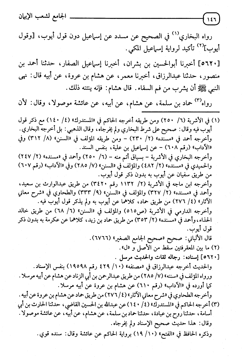5620 - أَخْبَرَنَا أَبُو الْحُسَيْنِ بْنُ بِشْرَانَ، أَنَا إِسْمَاعِيلُ الصَّفَارُ، ثَنَا أَحْمَدُ بْنُ مَنْصُورٍ، ثَنَا عَبْدُ الرَّزَّاقِ، أَنَا مَعْمَرٌ، عَنْ هِشَامِ بْنِ عُرْوَةَ، عَنْ أَبِيهِ قَالَ: §" نَهَى النَّبِيُّ صَلَّى اللَّهُ عَلَيْهِ وَسَلَّمَ أَنْ يُشْرَبَ مِنْ فَمِ السِّقَاءِ " " قَالَ هِشَامٌ فَإِنَّهُ ينتنه ذَلِكَ