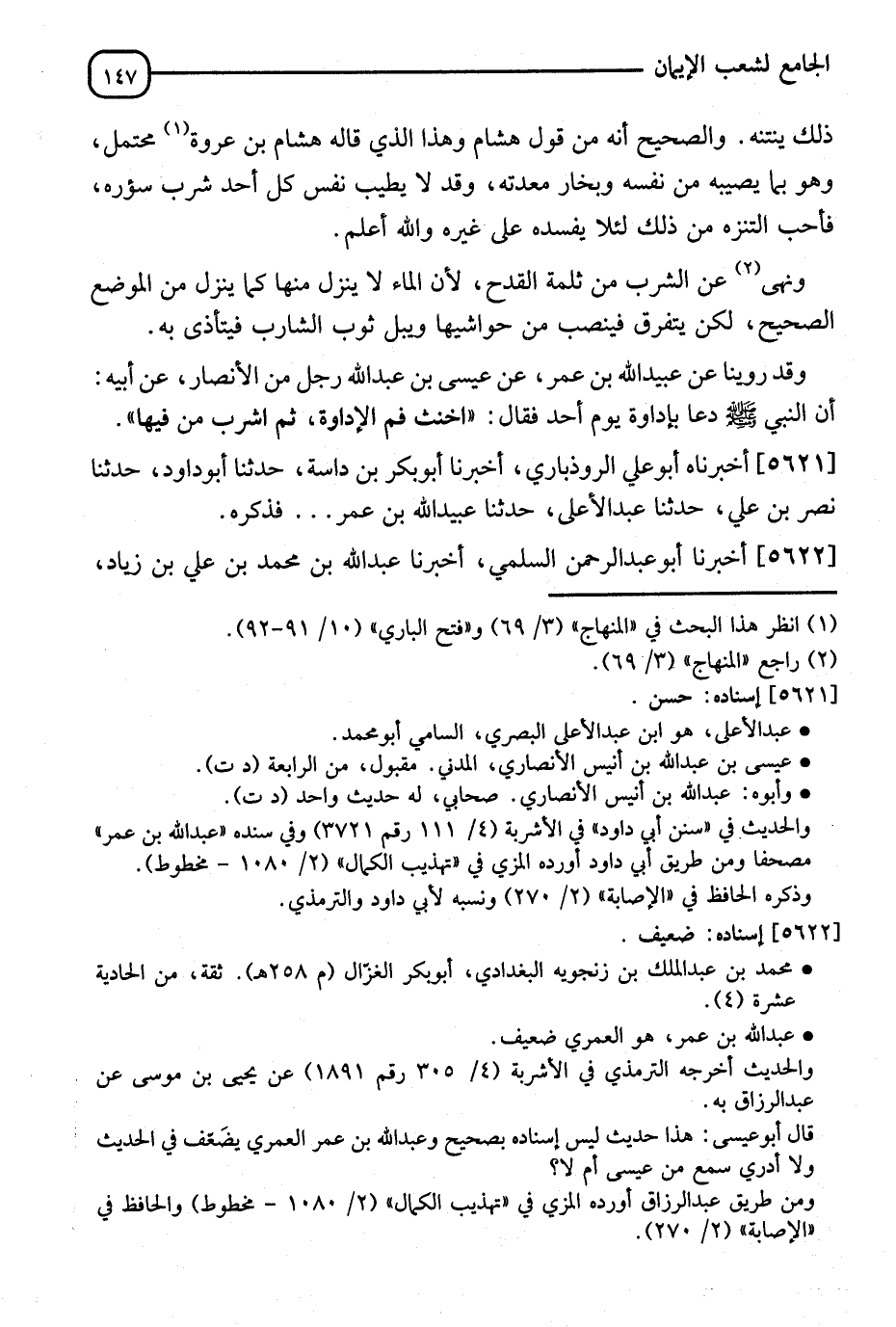 5622 - أَخْبَرَنَا أَبُو عَبْدِ الرَّحْمَنِ السَّلَمِيُّ، أَنَا عَبْدُ اللهِ بْنُ مُحَمَّدِ بْنِ عَلِيِّ بْنِ زِيَادٍ، -[148]- ثَنَا مُحَمَّدُ بْنُ إِسْحَاقَ بْنِ خُزَيْمَةَ، ثَنَا مُحَمَّدُ بْنُ عَبْدِ الْمَلِكِ بْنِ زَنْجَوَيْهِ، ثَنَا عَبْدُ الرَّزَّاقِ، ثَنَا عَبْدُ اللهِ بْنُ عُمَرَ، عَنْ عِيسَى بْنِ عَبْدِ اللهِ بْنِ أُنَيْسٍ، عَنْ أَنَسٍ قَالَ: " رَأَيْتُ رَسُولَ اللهِ صَلَّى اللَّهُ عَلَيْهِ وَسَلَّمَ §قَامَ إِلَى قِرْبَةٍ مُعَلَّقَةٍ فَخَلَسَهَا ثُمَّ شَرِبَ مِنْ فِيهَا " " الرِّوَايَةُ الْأُولَى أَتَمُّ وَإِسْنَادُ هَذَا أَحْفَظُ وَالظَّاهِرُ أَنَّ خَبَرَ النَّهْيِ كَانَ بَعْدَ هَذَا وَاللهُ أَعْلَمُ "