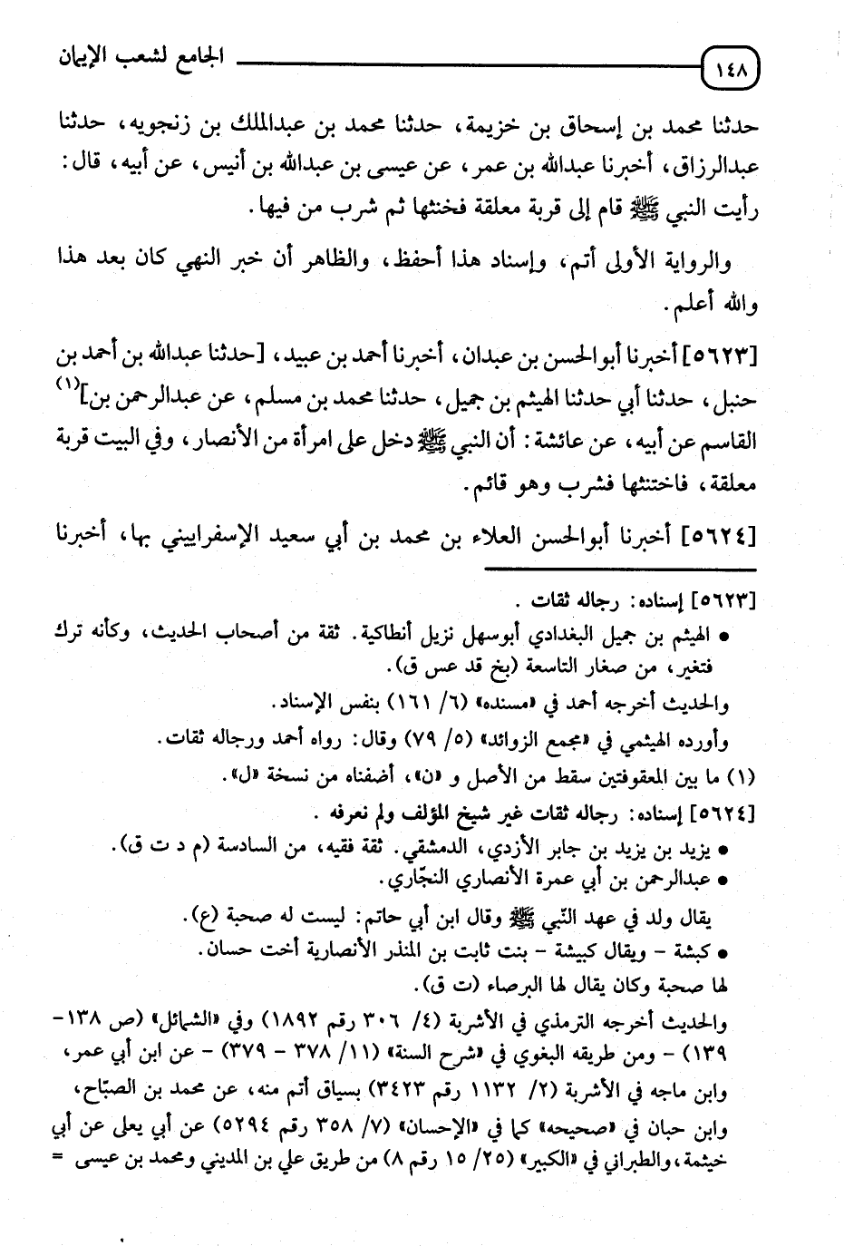 5624 - أَنَا أَبُو الْحَسَنِ الْعَلَاءُ بْنُ مُحَمَّدِ بْنِ سَعِيدٍ الْإِسْفَرَايِينِيُّ بِهَا، أَنَا -[149]- أَبُو سَهْلٍ الْإِسْفَرَايِينِيُّ، ثَنَا إِبْرَاهِيمُ بْنُ عَلِيٍّ الذُّهْلِيُّ، ثَنَا يَحْيَى بْنُ يَحْيَى، أَنَا سُفْيَانُ بْنُ عُيَيْنَةَ، عَنْ يَزِيدَ بْنِ يَزِيدَ بْنِ جَابِرٍ، عَنْ عَبْدِ الرَّحْمَنِ بْنِ أَبِي عَمْرَةَ، عَنْ جَدَّةٍ لَهُ يُقَالُ لَهَا كَبْشَةُ، أَنَّ النَّبِيَّ صَلَّى اللَّهُ عَلَيْهِ وَسَلَّمَ: §" دَخَلَ عَلَيْهَا فَشَرِبَ مِنْ قِرْبَةٍ مُعَلَّقَةٍ وَهُوَ قَائِمٌ " زَادَ فِيهِ غَيْرُهُ مِنْ فِيهَا وَهُوَ قَائِمٌ
