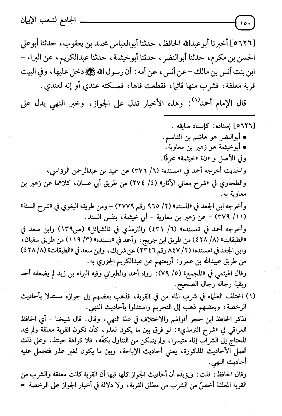 5626 - أَخْبَرَنَا أَبُو عَبْدِ اللهِ الْحَافِظُ، ثَنَا أَبُو الْعَبَّاسِ مُحَمَّدُ بْنُ يَعْقُوبَ، ثَنَا أَبُو عَلِيٍّ الْحَسَنُ بْنُ مُكْرَمٍ، ثَنَا أَبُو النَّصْرِ، ثَنَا خَيْثَمَةُ، ثَنَا عَبْدُ الْكَرِيمِ، عَنِ الْبَرَاءِ ابْنِ ابْنَةِ أَنَسِ بْنِ مَالِكٍ، عَنْ أَنَسٍ، عَنْ أُمِّهِ، " أَنَّ رَسُولَ اللهِ صَلَّى اللَّهُ عَلَيْهِ وَسَلَّمَ §دَخَلَ وَفِي الْبَيْتِ قِرْبَةٌ مُعَلَّقَةٌ فَشَرِبَ مِنْهَا قَائِمًا فَمَسَكْتُهُ عِنْدِي أَوْ إِنَّهُ لَعِنْدِي " قَالَ الْإِمَامُ أَحْمَدُ: وَهَذِهِ الْأَخْبَارُ تَدُلُّ عَلَى الْجَوَازِ وَخَبَرُ النَّهْيِ يَدُلُّ عَلَى -[151]- الِاسْتِحْبَابِ. تَنْحِيَةً لِلْأَذَى عَنِ الشَّارِبِ غَيْرِهِ بِتَرْكِ ذَلِكَ وَيُحْتَمَلُ أَنْ يَكُونَ خَبَرُ النَّهْيِ فِي غَيْرِ الْمُعَلَّقَةِ وَخَبَرُ الرُّخْصَةِ فِي الْمُعَلَّقَةِ فالْمُعَلَّقَةُ أَبَعْدُ مِنْ دُخُولِ الْجَانِّ فِيهَا وَاللهُ أَعْلَمُ "