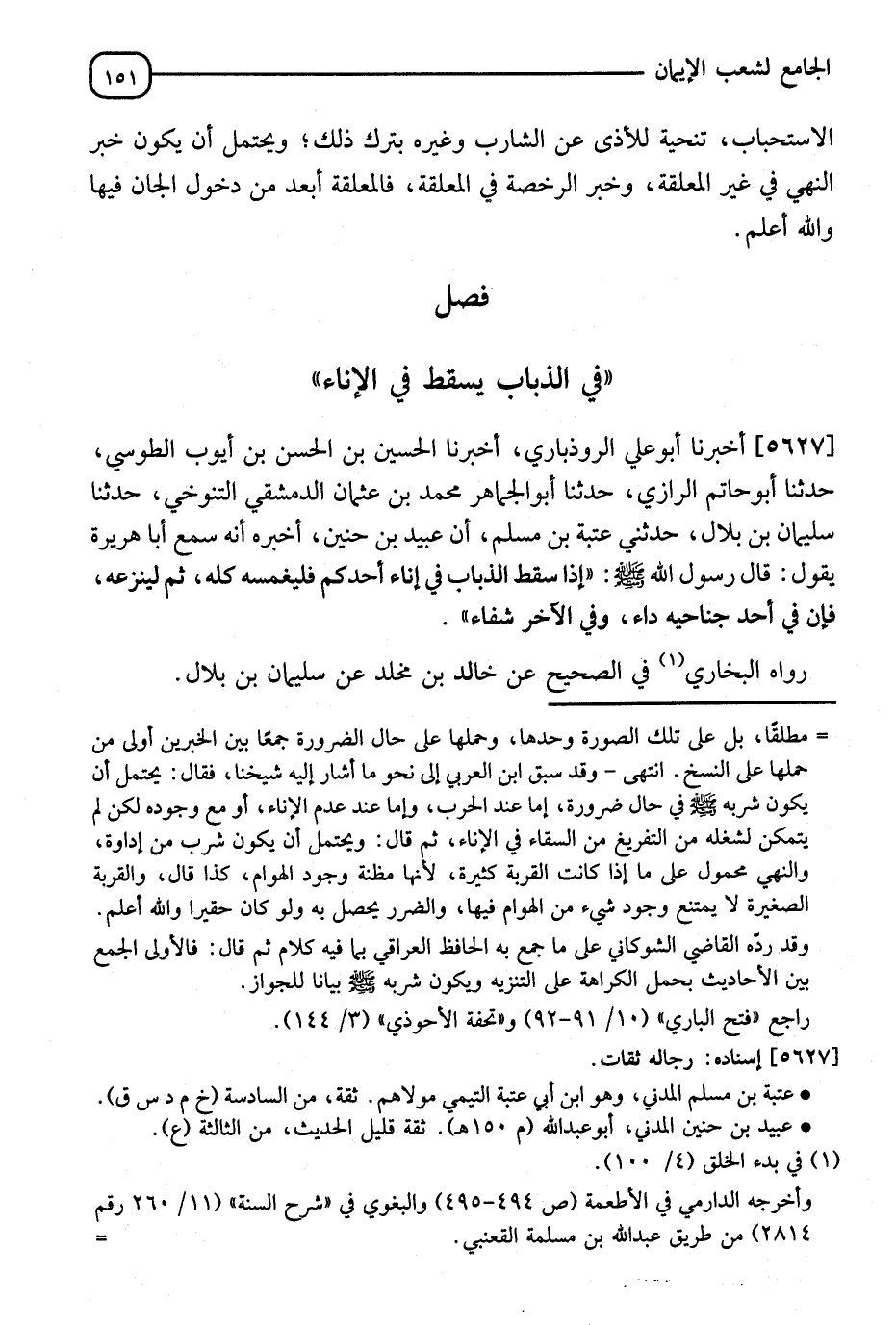 5627 - أَخْبَرَنَا أَبُو عَلِيٍّ الرُّوذْبَارِيُّ، أَنَا الْحُسَيْنُ بْنُ الْحَسَنِ بْنِ أَيُّوبَ الطُّوسِيُّ، ثَنَا أَبُو حَاتِمٍ الرَّازِيُّ، ثَنَا أَبُو الْجَمَاهِرِ مُحَمَّدُ بْنُ عُثْمَانَ الدِّمَشْقِيُّ التَّنُوخِيُّ، ثَنَا سُلَيْمَانُ بْنُ بِلَالٍ، حَدَّثَنِي عُتْبَةُ بْنُ مُسْلِمٍ، أَنَّ عُبَيْدَ بْنَ حُنَيْنٍ، أَخْبَرَهُ أَنَّهُ سَمِعَ أَبَا هُرَيْرَةَ يَقُولُ: قَالَ رَسُولُ اللهِ صَلَّى اللَّهُ عَلَيْهِ وَسَلَّمَ: " §إِذَا سَقَطَ الذُّبَابُ فِي إِنَاءِ أَحَدِكُمْ فَلْيَغْمِسْهُ كُلَّهُ، ثُمَّ لِيَنْزِعْهُ فَإِنَّ فِي أَحَدِ جَنَاحَيْهِ دَاءً وَفِي الْآخَرِ شِفَاءً " رَوَاهُ الْبُخَارِيُّ فِي الصَّحِيحِ، عَنْ خَالِدِ بْنِ مَخْلَدٍ، عَنْ سُلَيْمَانَ بْنِ بِلَالٍ، -[152]- قَالَ الشَّافِعِيُّ رَحِمَهُ اللهُ وَغَمْسُ الذُّبَابِ فِي الْإِنَاءِ لَيْسَ بِقَتْلِهِ