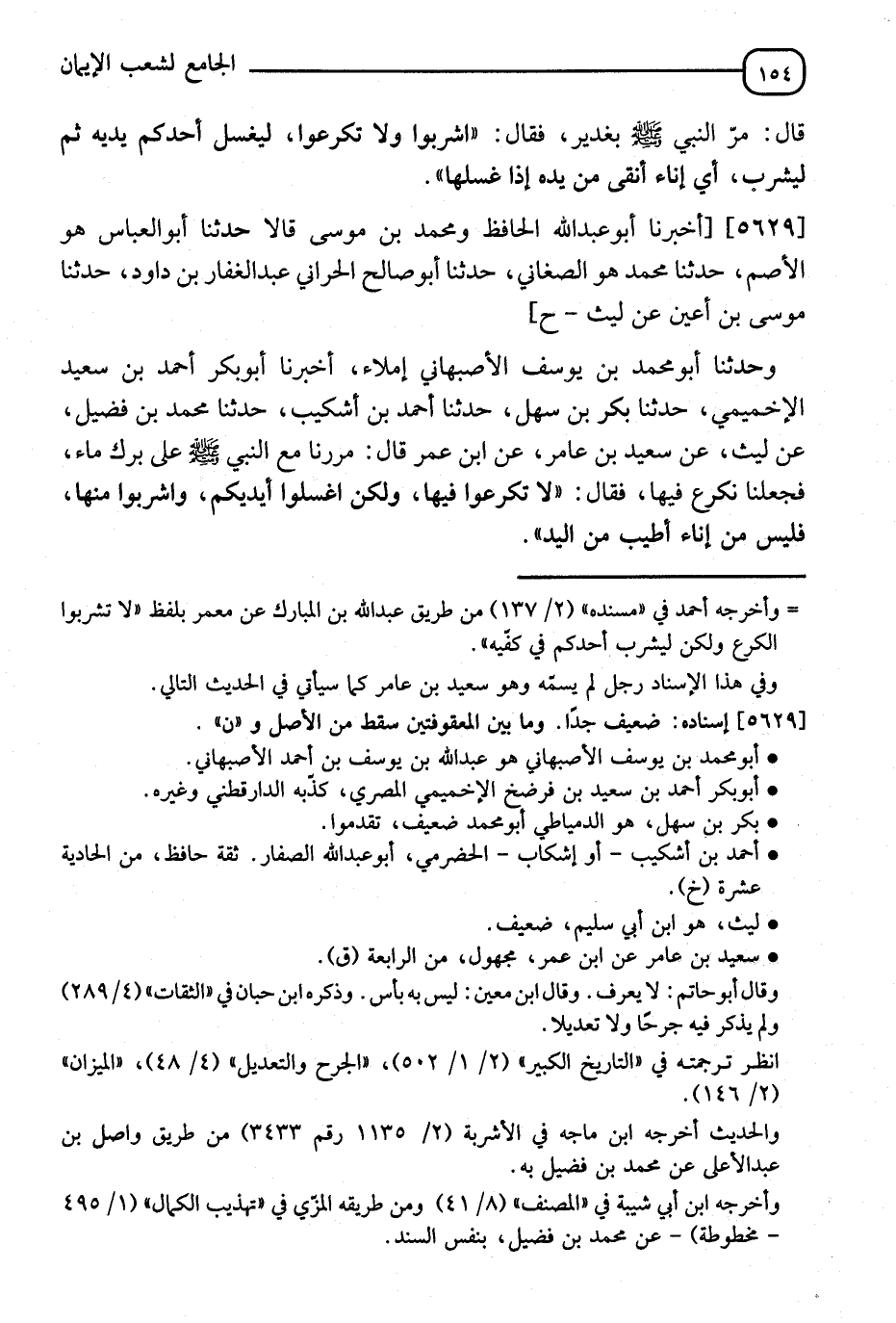 وَحَدَّثَنَا أَبُو مُحَمَّدٍ يُوسُفُ الْأَصْبَهَانِيُّ، إِمْلَاءً أَنَا أَبُو بَكْرٍ أَحْمَدُ بْنُ سَعِيدٍ الْإِخْمِيمِيُّ ثَنَا بَكْرُ بْنُ سَهْلٍ، ثَنَا أَحْمَدُ بْنُ أَشْكِيبَ، ثَنَا مُحَمَّدُ بْنُ فُضَيْلٍ، عَنْ لَيْثٍ، عَنْ سَعِيدِ بْنِ عَامِرٍ، عَنِ ابْنِ عُمَرَ قَالَ: مَرَرْنَا مَعَ النَّبِيِّ صَلَّى اللَّهُ عَلَيْهِ وَسَلَّمَ عَلَى بِرَكِ مَاءٍ فَجَعَلْنَا نَكْرَعُ فِيهَا فَقَالَ: " §لَا تَكْرَعُوا فِيهَا وَلَكِنِ اغْسِلُوا أَيْدِيَكُمْ، وَاشْرَبُوا مِنْهَا فَلَيْسَ مِنْ إِنَاءٍ أَطْيَبَ مِنَ الْيَدِ "