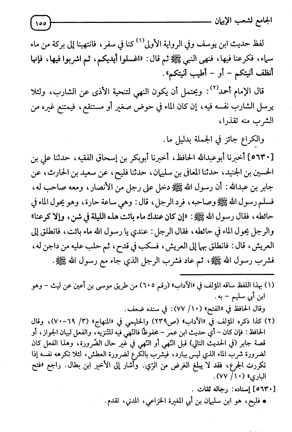 5630 - أَخْبَرَنَا أَبُو عَبْدِ اللهِ الْحَافِظُ، أَنَا أَبُو بَكْرِ بْنُ إِسْحَاقَ الْفَقِيهُ، ثَنَا عَلِيُّ بْنُ الْحُسَيْنِ بْنِ الْجُنَيْدِ، ثَنَا الْمُعَافَى بْنُ سُلَيْمَانَ، ثَنَا فُلَيْحٌ، عَنْ سَعِيدِ بْنِ الْحَارِثِ، عَنْ جَابِرِ بْنِ عَبْدِ اللهِ، أَنَّ رَسُولَ اللهِ صَلَّى اللَّهُ عَلَيْهِ وَسَلَّمَ دَخَلَ عَلَى رَجُلٍ مِنَ الْأَنْصَارِ وَمَعَهُ صَاحِبٌ لَهُ فَسَلَّمَ رَسُولُ اللهِ صَلَّى اللَّهُ عَلَيْهِ وَسَلَّمَ وَصَاحِبُهُ فَرَدَّ الرَّجُلُ قَالَ: وَهِيَ سَاعَةٌ حَارَّةٌ وَهُوَ يُحَوِّلُ الْمَاءَ فِي حَائِطِهِ، فَقَالَ رَسُولُ اللهِ صَلَّى اللَّهُ عَلَيْهِ وَسَلَّمَ: §" إِنْ كَانَ عِنْدَكَ مَاءٌ بَاتَ هَذِهِ اللَّيْلَةَ فِي شَنٍّ وَإِلَّا كَرَعْنَا وَالرَّجُلُ يُحَوِّلُ الْمَاءَ فِي حَائِطِهِ " فَقَالَ الرَّجُلُ: عِنْدِي يَا رَسُولَ اللهِ مَاءٌ بَايِتٌ فَانْطَلَقَ إِلَى الْعَرِيشِ قَالَ: فَانْطَلَقَ بِهِمَا إِلَى الْعَرِيشِ فَسَكَبَ فِي قَدَحٍ، ثُمَّ حَلَبَ عَلَيْهِ مِنْ دَاجِنٍ لَهُ، فَشَرِبَ رَسُولُ اللهِ صَلَّى اللَّهُ عَلَيْهِ وَسَلَّمَ ثُمَّ عَادَ فَشَرِبَ الرَّجُلُ الَّذِي جَاءَ مَعَ رَسُولِ اللهِ صَلَّى اللَّهُ عَلَيْهِ وَسَلَّمَ -[156]- رَوَاهُ الْبُخَارِيُّ فِي الصَّحِيحِ، عَنْ يَحْيَى بْنِ صَالِحٍ، عَنْ فُلَيْحٍ