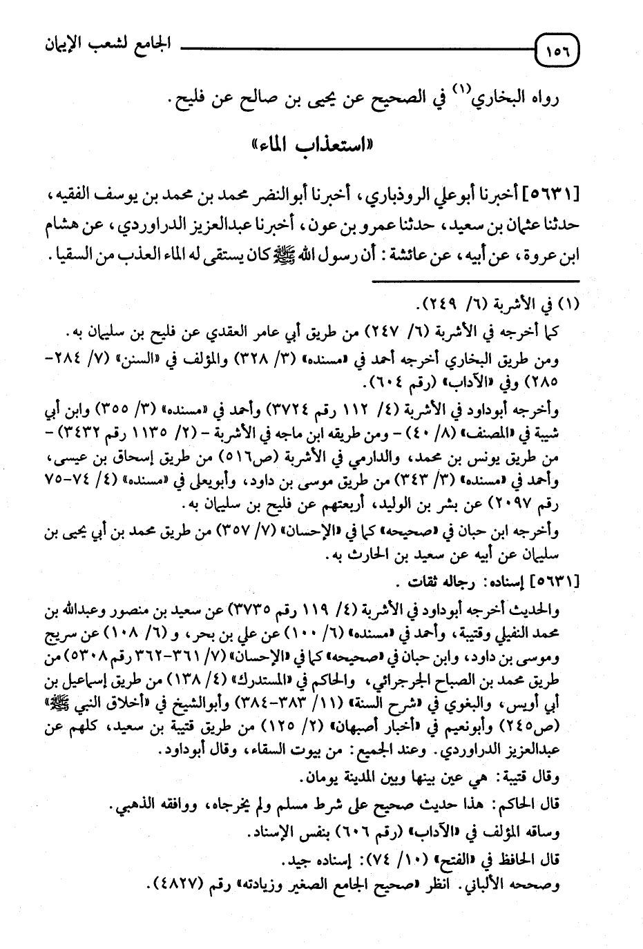 5631 - أَخْبَرَنَا أَبُو عَلِيٍّ الرُّوذْبَارِيُّ، أَنَا أَبُو النَّصْرِ مُحَمَّدُ بْنُ مُحَمَّدِ بْنِ يُوسُفَ الْفَقِيهُ، ثَنَا عُثْمَانُ بْنُ سَعِيدٍ، ثَنَا عَمْرُو بْنُ عَوْنٍ، أَنَا عَبْدُ الْعَزِيزِ الدَّرَاوَرْدِيُّ، عَنْ هِشَامِ بْنِ عُرْوَةَ، عَنْ أَبِيهِ، عَنْ عَائِشَةَ، " أَنَّ رَسُولَ اللهِ صَلَّى اللَّهُ عَلَيْهِ وَسَلَّمَ كَانَ §يُسْتَقَى لَهُ الْمَاءُ الْعَذْبُ مِنَ السِّقَاءِ " -[157]- وَحَكَى أَبُو دَاوُدَ السِّجِسْتَانِيُّ، عَنْ أَحْمَدَ بْنِ حَنْبَلٍ أَنَّهُ أَنْكَرَ هَذَا الْحَدِيثَ، وَقَالَ الدَّرَاوَرْدِيُّ: كِتَابُهُ أَصَحُّ مِنْ حِفْظِهِ، يُرِيدُ أَنَّهُ حَدَّثَ بِهِ حِفْظًا. قَالَ الْإِمَامُ أَحْمَدُ: " وَرُوِيَ مِنِ وَجْهٍ آخَرَ، عَنْ هِشَامٍ كَمَا "