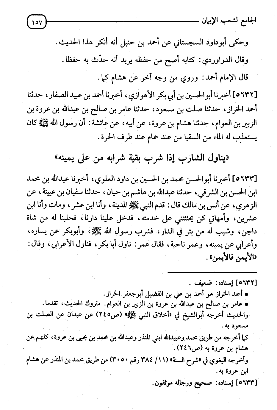 5633 - أَخْبَرَنَا أَبُو الْحَسَنِ مُحَمَّدُ بْنُ الْحُسَيْنِ بْنِ دَاوُدَ الْعَلَوِيُّ، أَنَا عَبْدُ اللهِ بْنُ مُحَمَّدِ بْنِ الْحَسَنِ الشَّرْقِيُّ، ثَنَا عَبْدُ اللهِ بْنُ هَاشِمِ بْنِ حَيَّانَ، ثَنَا سُفْيَانُ بْنُ عُيَيْنَةَ، عَنِ الزُّهْرِيِّ، عَنْ أَنَسِ بْنِ مَالِكٍ، قَالَ: §" قَدِمَ النَّبِيُّ صَلَّى اللَّهُ عَلَيْهِ وَسَلَّمَ الْمَدِينَةَ وَأَنَا ابْنُ عَشْرٍ وَمَاتَ وَأَنَا ابْنُ عِشْرِينَ، وَأُمَّهَاتِي كُنَّ يَحْثُثْنَنِي عَلَى خِدْمَتِهِ، فَدَخَلَ عَلَيْنَا دَارَنَا فَحَلَبْنَا لَهُ مِنْ شَاةٍ دَاجِنٍ وَشِيبَ لَهُ مِنِ بِئْرٍ فِي الدَّارِ، فَشَرِبَ رَسُولُ اللهِ صَلَّى اللَّهُ عَلَيْهِ وَسَلَّمَ، وَأَبُو بَكْرٍ عَنْ يَسَارِهِ وَأَعْرَابِيٌّ عَنْ يَمِينِهِ وَعُمَرُ نَاحِيَةً، فَقَالَ عُمَرُ: نَاوِلْ أَبَا بَكْرٍ، فَنَاوَلَ الْأَعْرَابِيَّ وَقَالَ: الْأَيْمَنُ فَالْأَيْمَنُ " -[158]- رَوَاهُ مُسْلِمٌ فِي الصَّحِيحِ، عَنْ أَبِي بَكْرِ بْنِ أَبِي شَيْبَةَ، وَغَيْرُهُ عَنْ سُفْيَانَ وَأَخْرَجَاهُ مِنْ حَدِيثِ مَالِكٍ، وَغَيْرُهُ عَنِ الزُّهْرِيِّ