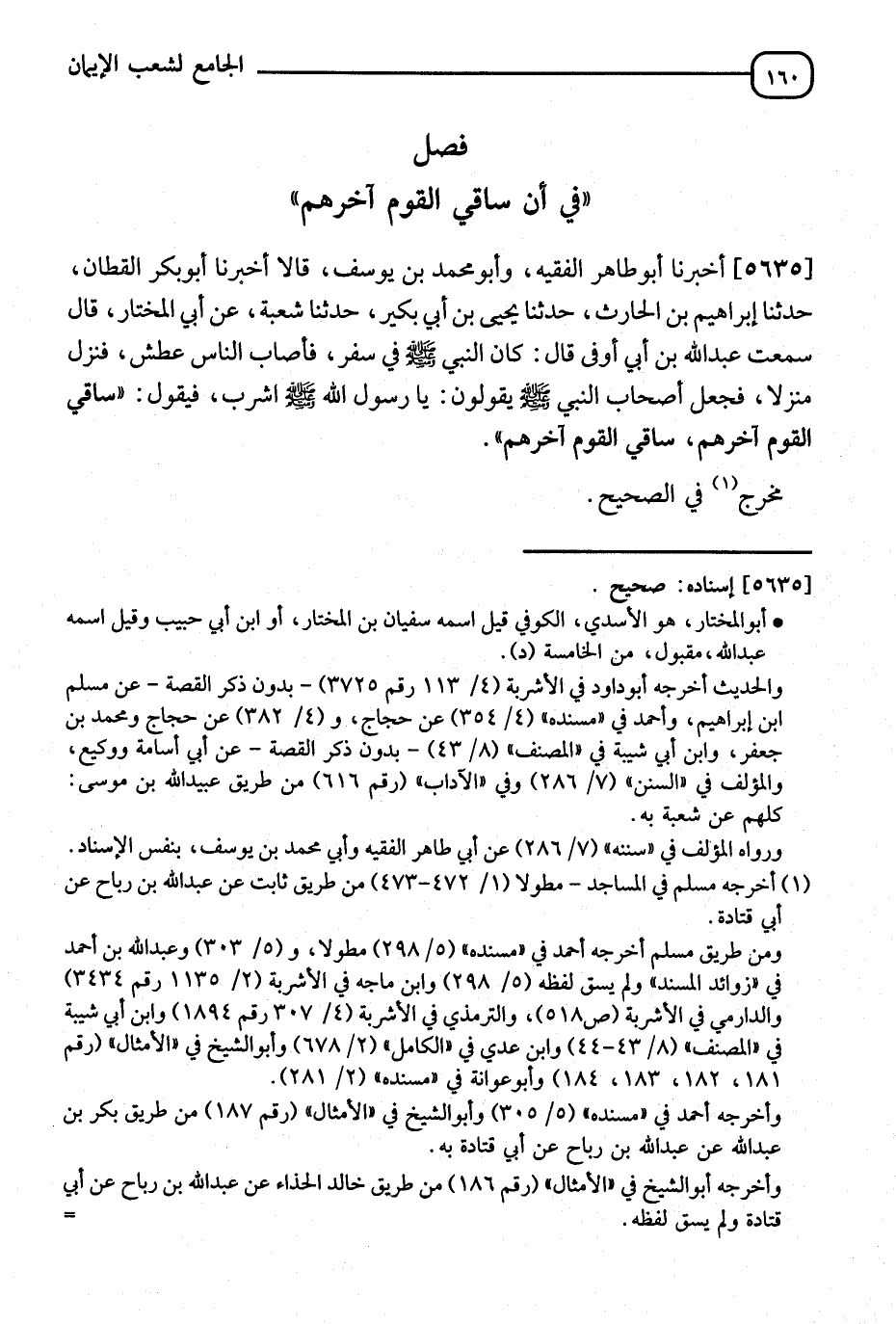 5635 - أَخْبَرَنَا أَبُو طَاهِرٍ الْفَقِيهُ، وَأَبُو مُحَمَّدِ بْنُ يُوسُفَ، قَالَا: أَنَا أَبُو بَكْرٍ الْقَطَّانُ، ثَنَا إِبْرَاهِيمُ بْنُ الْحَارِثِ، ثَنَا يَحْيَى بْنُ أَبِي بُكَيْرٍ، ثَنَا شُعْبَةُ، عَنْ أَبِي الْمُخْتَارِ، قَالَ: سَمِعْتُ عَبْدَ اللهِ بْنَ أَبِي أَوْفَى قَالَ: كَانَ النَّبِيُّ صَلَّى اللَّهُ عَلَيْهِ وَسَلَّمَ فِي سَفَرٍ فَأَصَابَ النَّاسَ عَطَشٌ فَنَزَلَ مَنْزِلًا فَجَعَلَ أَصْحَابُ النَّبِيِّ صَلَّى اللَّهُ عَلَيْهِ وَسَلَّمَ يَقُولُونَ: يَا رَسُولَ اللهِ: اشْرَبْ فَيَقُولُ: " §سَاقِي الْقَوْمِ آخِرُهُمْ، سَاقِي الْقَوْمِ آخِرُهُمْ " مُخَرَّجٌ فِي الصَّحِيحِ