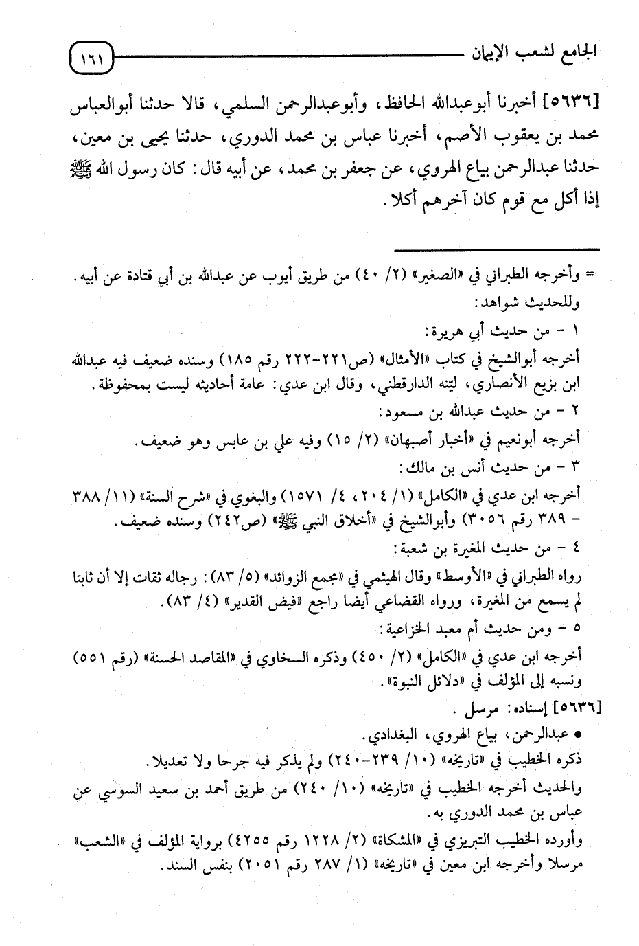 5636 - أَخْبَرَنَا أَبُو عَبْدِ اللهِ الْحَافِظُ، وَأَبُو عَبْدِ الرَّحْمَنِ السَّلَمِيُّ، قَالَا: ثَنَا أَبُو الْعَبَّاسِ مُحَمَّدُ بْنُ يَعْقُوبَ الْأَصَمُّ أَنَا عَبَّاسُ بْنُ مُحَمَّدٍ الدُّورِيُّ، ثَنَا يَحْيَى بْنُ مَعِينٍ، ثَنَا عَبْدُ الرَّحْمَنِ بَيَّاعُ الْهَرَوِيِّ، عَنْ جَعْفَرِ بْنِ مُحَمَّدٍ، عَنْ أَبِيهِ قَالَ: " كَانَ رَسُولُ اللهِ صَلَّى اللَّهُ عَلَيْهِ وَسَلَّمَ §إِذَا أَكَلَ مَعَ قَوْمٍ كَانَ آخِرَهُمْ أَكْلًا "