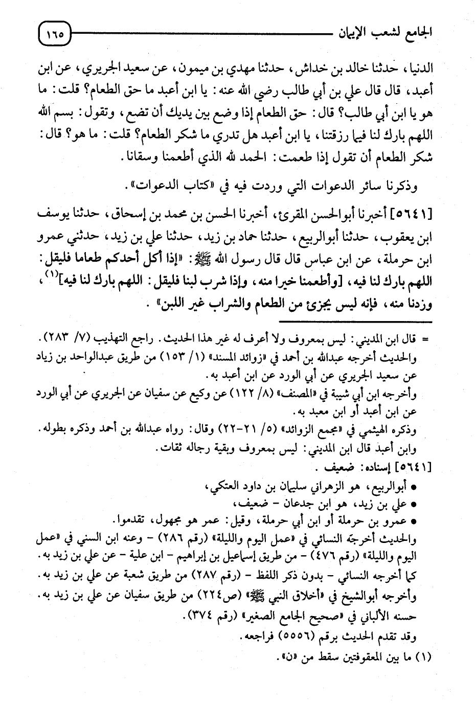 5641 - أَخْبَرَنَا أَبُو الْحَسَنِ الْمُقْرِئُ، أَنَا الْحَسَنُ بْنُ مُحَمَّدِ بْنِ إِسْحَاقَ، ثَنَا يُوسُفُ بْنُ يَعْقُوبَ، ثَنَا أَبُو الرَّبِيعِ، ثَنَا حَمَّادُ بْنُ زَيْدٍ، ثَنَا عَلِيُّ بْنُ زَيْدٍ، حَدَّثَنِي عُمَرُ بْنُ أَبِي حَرْمَلَةَ، عَنِ ابْنِ عَبَّاسٍ قَالَ: قَالَ رَسُولُ اللهِ صَلَّى اللَّهُ عَلَيْهِ وَسَلَّمَ: " §إِذَا أَكَلَ أَحَدُكُمْ طَعَامًا فَلْيَقُلِ: اللهُمَّ بَارِكْ لَنَا فِيهِ وَأَطْعِمْنَا خَيْرًا مِنْهُ وَإِذَا شَرِبَ لَبَنًا فَلْيَقُلِ: اللهُمَّ بَارِكْ لَنَا فِيهِ وَزِدْنَا مِنْهُ فَإِنَّهُ لَيْسَ يَجْزِي مِنَ الطَّعَامِ وَالشَّرَابِ غَيْرُ اللَّبَنِ "