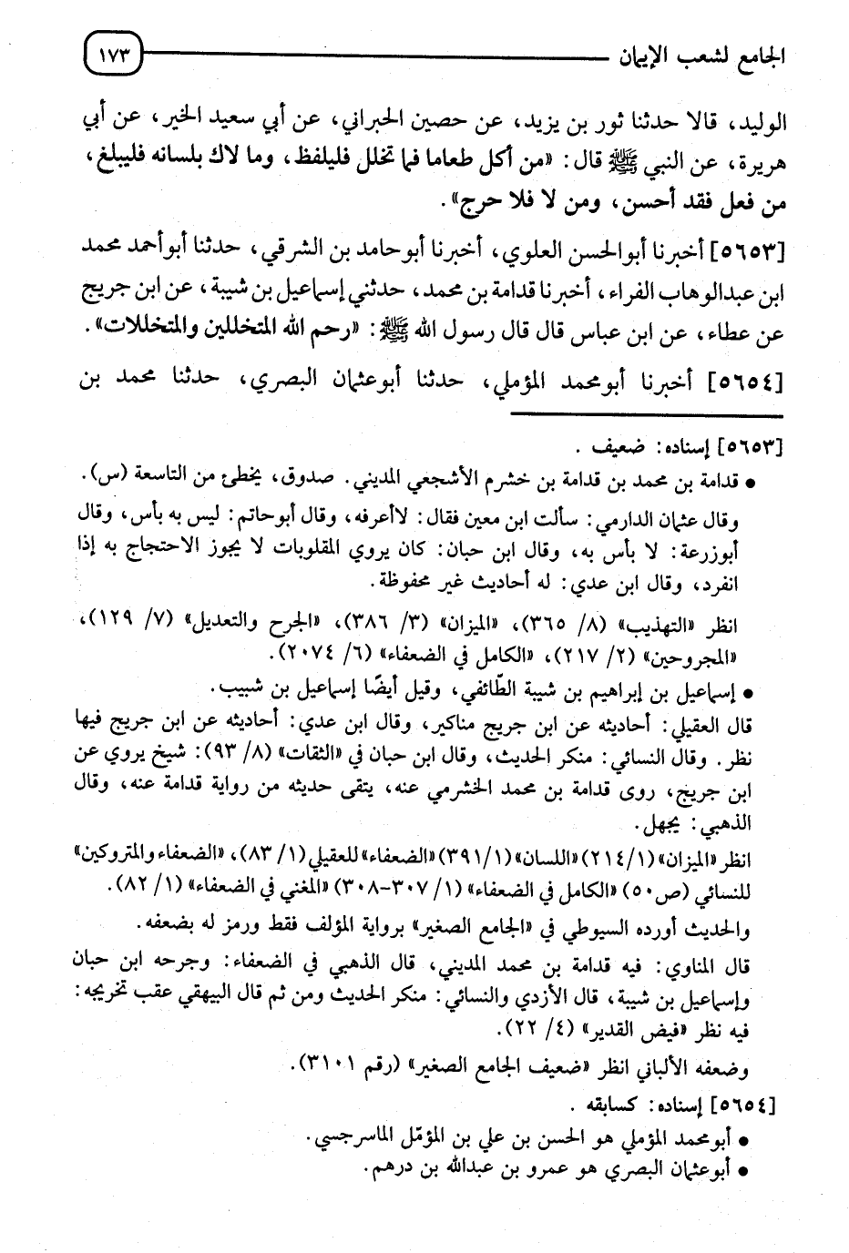 5654 - أَخْبَرَنَا أَبُو مُحَمَّدٍ الْمُؤَمَّلِيُّ، ثَنَا أَبُو عُثْمَانَ الْبَصْرِيُّ، ثَنَا مُحَمَّدُ بْنُ -[174]- عَبْدِ الْوَهَّابِ، فَذَكَرَهُ زَادَ فَقِيلَ لِإِسْمَاعِيلَ: مَا تَرَاهُ عَنِّي؟ قَالَ: الْفَمُ، تَفَرَّدَ بِهِ قُدَامَةُ بْنُ مُحَمَّدٍ، عَنْ إِسْمَاعِيلَ بْنِ إِبْرَاهِيمَ بْنِ شَيْبَةَ الطَّالِعِ وَكِلَاهُمَا فِيهِ نَظَرٌ