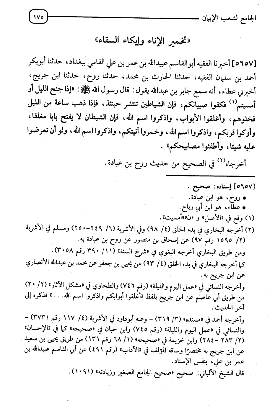 5657 - أَخْبَرَنَا الْفَقِيهُ أَبُو الْقَاسِمِ عُبَيْدُ اللهِ بْنُ عُمَرَ بْنِ عَلِيٍّ الْفَامِيُّ، بِبَغْدَادَ ثَنَا أَبُو بَكْرٍ أَحْمَدُ بْنُ سَلْمَانَ الْفَقِيهُ، ثَنَا الْحَارِثُ بْنُ مُحَمَّدٍ، ثَنَا رَوْحٌ، ثَنَا ابْنُ جُرَيْجٍ، أَخْبَرَنِي عَطَاءٌ، أَنَّهُ سَمِعَ جَابِرَ بْنَ عَبْدِ اللهِ يَقُولُ: قَالَ رَسُولُ اللهِ صَلَّى اللَّهُ عَلَيْهِ وَسَلَّمَ: " إِذَا §ضَجَّ اللَّيْلُ أَوْ أَمْسَيْتُمْ فَكُفُّوا صِبْيَانَكُمْ، فَإِنَّ الشَّيَاطِينَ تَنْتَشِرُ حِينَئِذٍ فَإِذَا ذَهَبَ سَاعَةٌ مِنَ اللَّيْلِ فَخَلُّوهُمْ وَأَغْلِقُوا الْأَبْوَابَ وَاذْكُرُوا اسْمَ اللهِ فَإِنَّ الشَّيْطَانَ لَا يَفْتَحُ بَابًا مُغْلَقًا وَأَوْكُوا قِرَبَكُمْ وَاذْكُرُوا اسْمَ اللهِ وَخَمِّرُوا آنِيَتَكُمْ وَاذْكُرُوا اسْمَ اللهِ وَلَوْ أَنْ تَعْرُضُوا عَلَيْهِ شَيْئًا وَأَطْفِئُوا مَصَابِيحَكُمْ " أَخْرَجَاهُ فِي الصَّحِيحِ مِنْ حَدِيثِ رَوْحِ بْنِ عُبَادَةَ