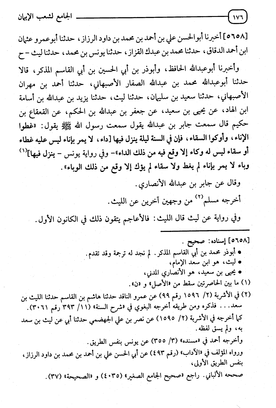 5658 - أَخْبَرَنَا أَبُو الْحَسَنِ عَلِيُّ بْنُ أَحْمَدَ بْنِ مُحَمَّدِ بْنِ دَاوُدَ الرَّزَّازُ ثَنَا أَبُو عَمْرٍو عُثْمَانُ بْنُ أَحْمَدَ الدَّقَّاقُ ثَنَا مُحَمَّدُ بْنُ عَبْدَكٍ الْقَرَّارُ، ثَنَا يُونُسُ بْنُ مُحَمَّدٍ، ثَنَا لَيْثٌ، ح وَأَخْبَرَنَا أَبُو عَبْدِ اللهِ الْحَافِظُ، وَأَبُو ذَرِّ بْنُ الْحُسَيْنِ بْنِ أَبِي الْقَاسِمِ الْمُذَكِّي، قَالَا: ثَنَا أَبُو عَبْدِ اللهِ مُحَمَّدُ بْنُ عَبْدِ اللهِ الصَّفَارُ الْأَصْبَهَانِيُّ، ثَنَا أَحْمَدُ بْنُ مِهْرَانَ الْأَصْبَهَانِيُّ، ثَنَا سَعِيدُ بْنُ سُلَيْمَانَ، ثَنَا لَيْثٌ، ثَنَا يَزِيدُ بْنُ عَبْدِ اللهِ بْنِ أُسَامَةَ بْنِ الْهَادِ، عَنْ يَحْيَى بْنِ سَعِيدٍ، عَنْ جَعْفَرِ بْنِ عَبْدِ اللهِ بْنِ الْحَكَمِ، عَنِ الْقَعْقَاعِ بْنِ حَكِيمٍ، قَالَ: سَمِعْتُ جَابِرَ بْنَ عَبْدِ اللهِ يَقُولُ: سَمِعْتُ رَسُولَ اللهِ صَلَّى اللَّهُ عَلَيْهِ وَسَلَّمَ يَقُولُ:" §غَطُّوا الْإِنَاءَ وَأَوْكُوا السِّقَاءَ فَإِنَّ فِي السَّنَةِ لَيْلَةً يَنْزِلُ فِيهَا وَبَاءٌ لَا يَمُرُّ بِإِنَاءٍ لَمْ يُغَطَّ وَلَا سِقَاءٍ لَمْ يُوكَ إِلَّا وَقَعَ فِيهِ مِنْ ذَلِكَ الْوَبَاءِ" وَقَالَ: عَنْ جَابِرِ بْنِ عَبْدِ اللهِ الْأَنْصَارِيِّ أَخْرَجَهُ مُسْلِمٌ مِنْ وَجْهَيْنِ آخَرَيْنِ عَنِ اللَّيْثِ وَفِي رِوَايَةٍ، عَنْ لَيْثٍ، قَالَ اللَّيْثُ: فَالْأَعَاجِمُ يَتَّقُونَ ذَلِكَ مِنَ الْكَانُونِ الْأَوَّلِ