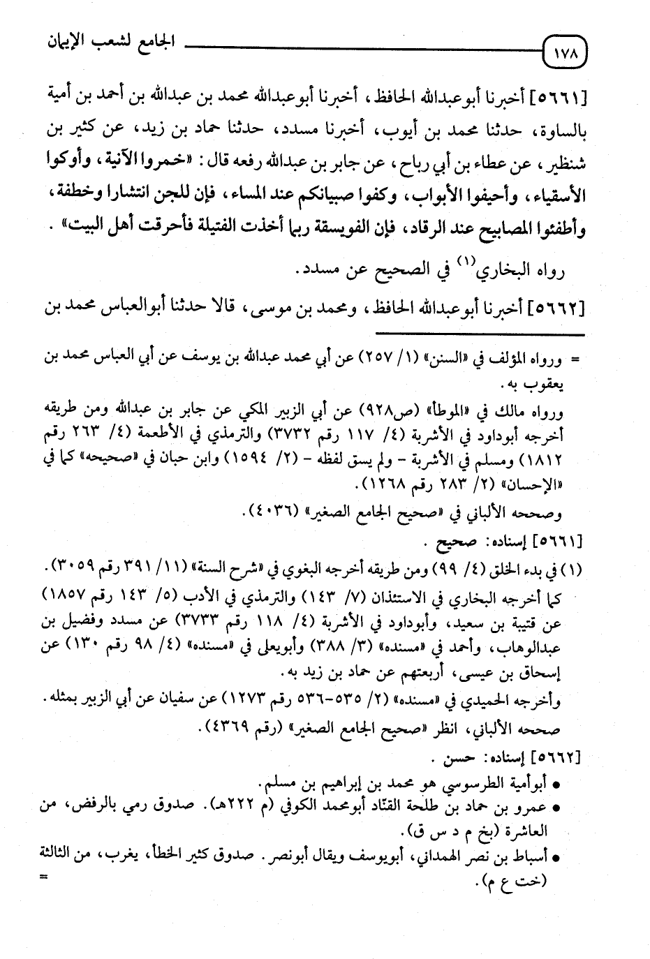 5661 - أَخْبَرَنَا أَبُو عَبْدِ اللهِ الْحَافِظُ، أَنَا أَبُو عَبْدِ اللهِ مُحَمَّدُ بْنُ عَبْدِ اللهِ بْنِ أَحْمَدَ بْنِ أُمَيَّةَ السَّبَّاقُ، ثَنَا مُحَمَّدُ بْنُ أَيُّوبَ، أَنَا مُسَدَّدٌ، ثَنَا حَمَّادُ بْنُ زَيْدٍ، عَنْ كَثِيرِ بْنِ شِنْظِيرٍ، عَنْ عَطَاءِ بْنِ أَبِي رَبَاحٍ، عَنْ جَابِرِ بْنِ عَبْدِ اللهِ، رَفَعَهُ قَالَ: §" خَمِّرُوا الْآنِيَةَ وَأَوْكُوا الْأَسْقِيَةَ وَأَجِيفُوا الْأَبْوَابَ وَكُفُّوا صِبْيَانَكُمْ عِنْدَ الْمَسَاءِ فَإِنَّ لِلْجِنِّ انْتِشَارًا وَخَطْفَةً، وَأَطْفِئُوا الْمَصَابِيحَ عِنْدَ الرُّقَادِ فَإِنَّ الْفُوَيْسِقَةَ رُبَّمَا أَخَذَتِ الْفَتِيلَةَ فَأَحْرَقَتْ أَهْلَ الْبَيْتِ " رَوَاهُ الْبُخَارِيُّ فِي الصَّحِيحِ، عَنْ مُسَدَّدٍ