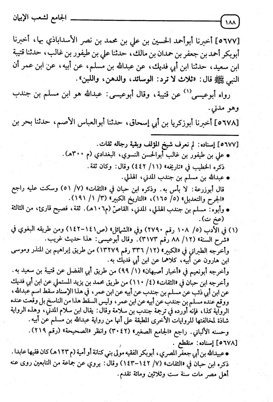 5677 - أَخْبَرَنَا أَبُو أَحْمَدَ الْحُسَيْنُ بْنُ عَلُوشَا بْنِ مُحَمَّدِ بْنِ نَصْرٍ الْأَسْدَ آبَادِيُّ بِهَا، أَنَا أَبُو بَكْرٍ أَحْمَدُ بْنُ جَعْفَرِ بْنِ حَمْدَانَ بْنِ مَالِكٍ، ثَنَا عَلِيُّ بْنُ طَيْفُورِ بْنِ غَالِبٍ، ثَنَا قُتَيْبَةُ بْنُ سَعِيدٍ، ثَنَا ابْنُ أَبِي فُدَيْكٍ، عَنْ عَبْدِ اللهِ بْنِ مُسْلِمٍ، عَنْ أَبِيهِ، عَنِ ابْنِ عُمَرَ: أَنَّ النَّبِيَّ صَلَّى اللَّهُ عَلَيْهِ وَسَلَّمَ قَالَ: " §ثَلَاثٌ لَا تُرَدُّ: الْوَسَائِدُ وَالدُّهْنُ وَاللَّبَنُ " رَوَاهُ أَبُو عِيسَى، عَنْ قُتَيْبَةَ وَقَالَ: أَبُو عِيسَى عَبْدُ اللهِ بْنُ مُسْلِمِ بْنِ جُنْدُبٍ وَهُوَ مَدَنِيٌّ