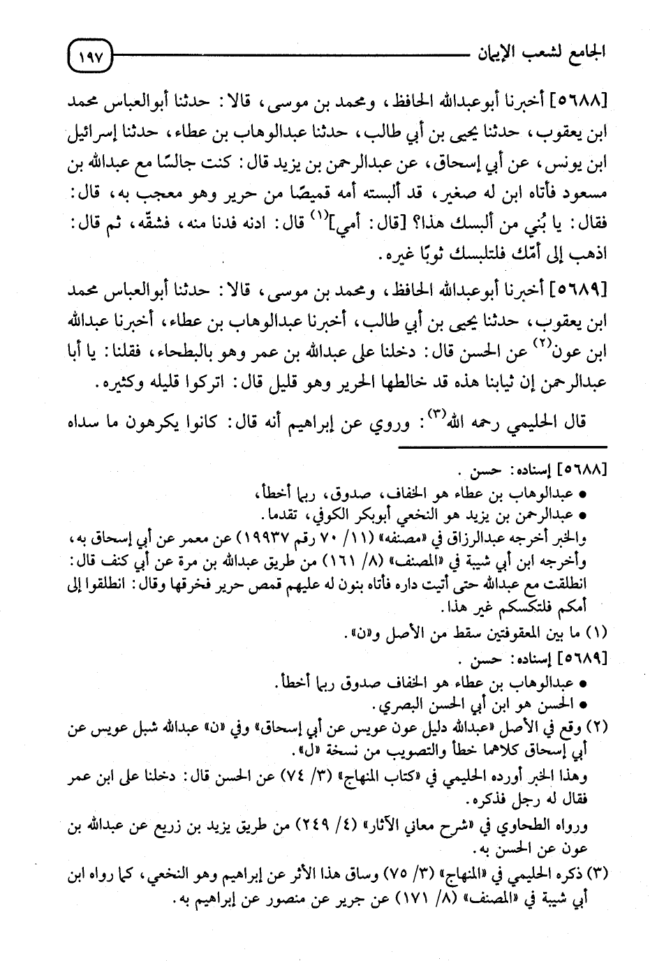 5689 - أَخْبَرَنَا أَبُو عَبْدِ اللهِ الْحَافِظُ، وَمُحَمَّدُ بْنُ مُوسَى، قَالَا: ثَنَا أَبُو الْعَبَّاسِ مُحَمَّدُ بْنُ يَعْقُوبَ، ثَنَا يَحْيَى بْنُ أَبِي طَالِبٍ، أَنَا عَبْدُ الْوَهَّابِ بْنُ عَطَاءٍ، أَنَا عَبْدُ اللهِ، سُئِلَ عُوَيْسٌ، عَنْ أَبِي إِسْحَاقَ قَالَ: دَخَلْنَا عَلَى عَبْدِ اللِّهِ بْنِ عُمَرَ وَهُوَ بِالْبَطْحَاءِ فَقُلْنَا: يَا أَبَا عَبْدِ الرَّحْمَنِ إِنَّ ثِيَابَنَا هَذِهِ قَدْ خَالَطَهَا الْحَرِيرُ وَهُوَ قَلِيلٌ قَالَ: §" اتْرُكُوا قَلِيلَهُ وَكَثِيرَهُ " قَالَ الْحَلِيمِيُّ رَحِمَهُ اللهُ