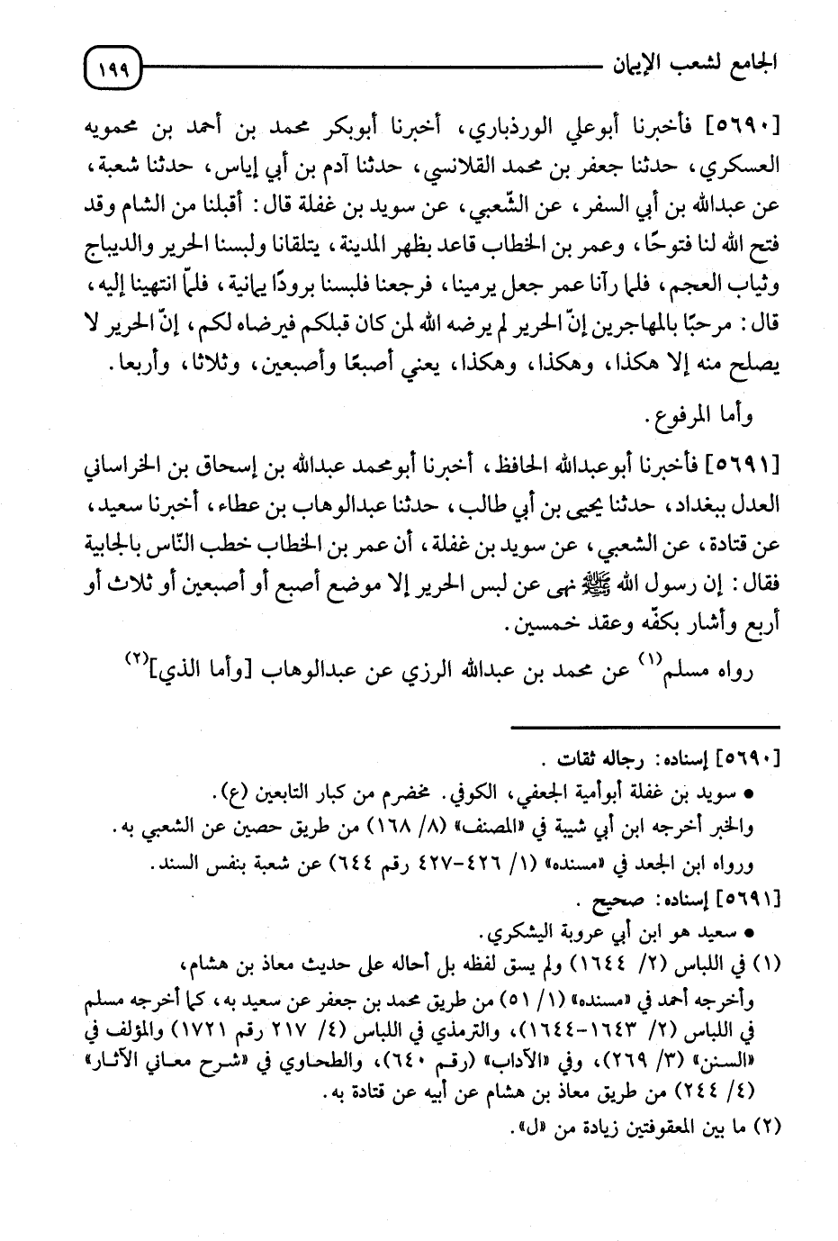5690 - فَأَخْبَرَنَا أَبُو عَلِيٍّ الرُّوذْبَارِيُّ، أَنَا أَبُو بَكْرٍ مُحَمَّدُ بْنُ أَحْمَدَ بْنِ مَحْمَوَيْهِ الْعَسْكَرِيُّ، أَنَا جَعْفَرُ بْنُ مُحَمَّدٍ الْقَلَانِسِيُّ، ثَنَا آدَمُ بْنُ أَبِي إِيَاسٍ، ثَنَا سَعِيدٌ، عَنْ عَبْدِ اللهِ بْنِ أَبِي السَّفَرِ، عَنِ الشَّعْبِيِّ، عَنْ سُوَيْدِ بْنِ غَفَلَةَ قَالَ: أَقْبَلْنَا مِنَ الشَّامِ وَقَدْ فَتَحَ اللهُ لَنَا فُتُوحًا وَعُمَرُ بْنُ الْخَطَّابِ قَاعِدٌ بِظَهْرِ الْمَدِينَةِ يَتَلَقَّانَا وَلَبِسْنَا الْحَرِيرَ وَالدِّيبَاجَ، وَثِيَابَ الْعَجَمِ فَلَمَّا رَآنَا جَعَلَ يَرْمِينَا فَرَجَعْنَا، فَلَبِسْنَا بُرُودًا يَمَانِيَةً فَلَمَّا انْتَهَيْنَا إِلَيْهِ قَالَ: §" مَرْحَبًا بِالْمُهَاجِرِينَ إِنَّ الْحَرِيرَ لَمْ يَرْضَهُ اللهُ لِمَنْ كَانَ قَبْلَكُمْ فَيَرْضَاهُ لَكُمْ إِنَّ الْحَرِيرَ لَا يَصْلُحُ مِنْهُ إِلَّا هَكَذَا وَهَكَذَا يَعْنِي إِصْبَعًا وَإِصْبَعَيْنِ وَثَلَاثًا وَأَرْبَعًا وَأَمَّا الْمَرْفُوعُ "