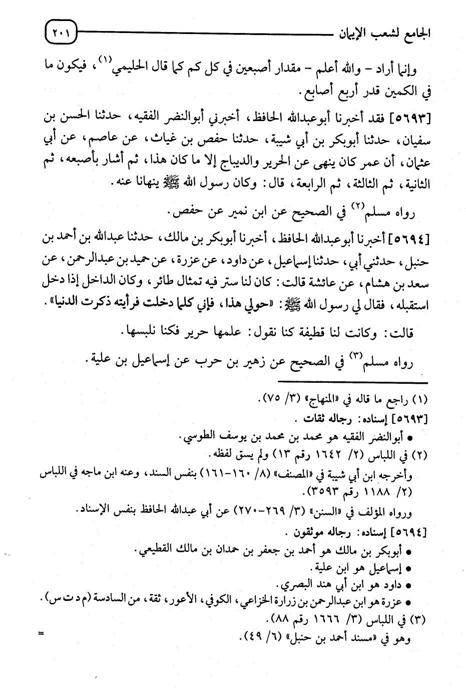5694 - أَخْبَرَنَا أَبُو عَبْدِ اللهِ الْحَافِظُ، أَنَا أَبُو بَكْرِ بْنُ مَالِكٍ، ثَنَا عَبْدُ اللهِ بْنُ أَحْمَدَ بْنِ حَنْبَلٍ، حَدَّثَنِي أَبِي، ثَنَا إِسْمَاعِيلُ، عَنْ دَاوُدَ، عَنْ عُرْوَةَ، عَنْ حُمَيْدِ بْنِ عَبْدِ الرَّحْمَنِ، عَنْ سَعْدِ بْنِ هِشَامٍ، عَنْ عَائِشَةَ قَالَ: كَانَ لَنَا سِتْرٌ فِيهِ تِمْثَالُ طَائِرٍ وَكَانَ الدَّاخِلُ إِذَا دَخَلَ اسْتَقْبَلَهُ فَقَالَ لِي رَسُولُ اللهِ صَلَّى اللَّهُ عَلَيْهِ وَسَلَّمَ: §" حَوْلِي هَذَا فَإِنِّي كُلَّمَا دَخَلْتُ فَرَأَيْتُهُ ذَكَرْتُ الدُّنْيَا " قَالَتْ: وَكَانَ لَنَا قَطِيفَةٌ كَمَا تَقُولُ عَلَمُهَا حَرِيرٌ فَكُنْتُ أَلْبَسُهَا رَوَاهُ مُسْلِمٌ فِي الصَّحِيحِ، عَنْ زُهَيْرِ بْنِ حَرْبٍ، عَنْ إِسْمَاعِيلَ بْنِ عُلَيَّةَ. -[202]- وَأَمَّا مَا قَالَ الْحَلِيمِيُّ رَحِمَهُ اللهُ: مِنَ الْإِنْكَارِ عَلَى مَنْ فَرَّقَ بَيْنَ السُّدَّى وَاللُّحْمَةِ هَذَا مَبْنِيٌّ عَلَى مَا رُوِيَ فِي ذَلِكَ، عَنْ عَبْدِ اللهِ بْنِ عَبَّاسٍ فَإِنْ كَانَ غَيْرَ ثَابِتٍ فَالْأَمْرُ عَلَى مَا قَالَ الْحَلِيمِيُّ رَحِمَهُ اللهُ وَإِنْ كَانَ ثَابِتًا فَلَا مَعْنَى لِإِْنِكَارِهِ وَهُوَ إِذَا أَدَّاهُ احْتَجَّ فِي كِتَابِهِ بِمَا هُوَ أَضْعَفُ مِنْ حَدِيثِ ابْنِ عَبَّاسٍ بِكَثِيرٍ وَحَدِيثِ ابْنِ عَبَّاسٍ قَدْ أَخْرَجَهُ أَبُو دَاوُدَ فِي كِتَابِ السُّنَنِ وَهُوَ فِيمَا