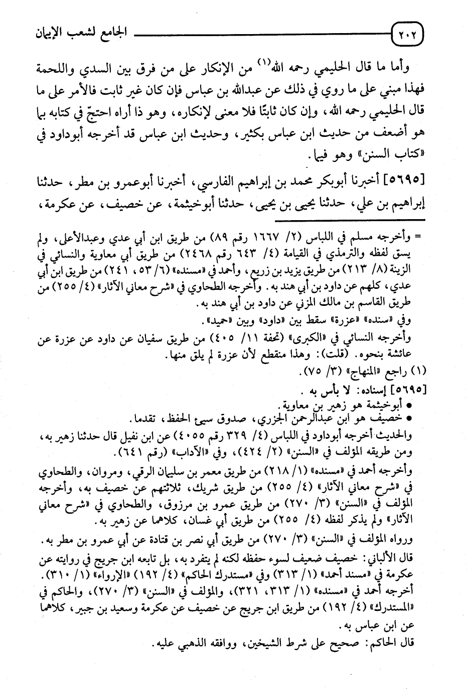 5695 - أَخْبَرَنَا أَبُو بَكْرٍ مُحَمَّدُ بْنُ إِبْرَاهِيمَ الْفَارِسِيُّ، أَنَا أَبُو عَمْرِو بْنُ مَطَرٍ، ثَنَا إِبْرَاهِيمُ بْنُ عَلِيٍّ، ثَنَا يَحْيَى بْنُ يَحْيَى، أَنَا أَبُو خَيْثَمَةَ، عَنْ خُصَيْفٍ، عَنْ عِكْرِمَةَ، -[203]- عَنِ ابْنِ عَبَّاسٍ قَالَ: " إِنَّمَا §كَرِهَ نَبِيُّ اللهِ عَلَيْهِ وَسَلَّمَ الثَّوْبَ الْمُصْمَتَ مِنَ الْحَرِيرِ، فَأَمَّا الْعَلَمُ مِنَ الْحَرِيرِ أَوْ سُدَى الثَّوْبِ فَلَيْسَ بِهِ بَأْسٌ " قَالَ الشَّيْخُ: وَهَذَا حَدِيثٌ رَوَاهُ زُهَيْرُ بْنُ مُعَاوِيَةَ أَبُو خَيْثَمَةَ، عَنْ خُصَيْفٍ هَكَذَا. وَرَوَاهُ ابْنُ جُرَيْجٍ، عَنْ خُصَيْفٍ، عَنْ عِكْرِمَةَ وَسَعِيدِ بْنِ جُبَيْرٍ، عَنِ ابْنِ عَبَّاسٍ هَكَذَا فِي رِوَايَةٍ أُخْرَى فَأَمَّا أَنْ يَكُونَ سُدَاهُ أَوْ لُحْمَتُهُ حَرِيرًا فَلَا بَأْسَ بِلُبْسِهِ. وَكَذَلِكَ رَوَاهُ إِسْمَاعِيلُ بْنُ مُسْلِمٍ، عَنْ عَطَاءٍ، عَنِ ابْنِ عَبَّاسٍ