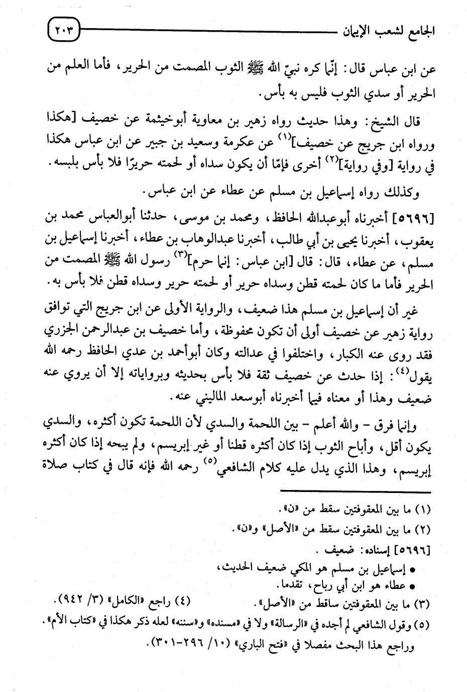 5696 - أَخْبَرَنَاهُ أَبُو عَبْدِ اللهِ الْحَافِظُ، وَمُحَمَّدُ بْنُ مُوسَى، ثَنَا أَبُو الْعَبَّاسِ مُحَمَّدُ بْنُ يَعْقُوبَ، أَنَا يَحْيَى بْنُ أَبِي طَالِبٍ، أَنَا عَبْدُ الْوَهَّابِ بْنُ عَطَاءٍ، أَنَا إِسْمَاعِيلُ بْنُ مُسْلِمٍ، عَنْ عَطَاءٍ قَالَ: ابْنُ عَبَّاسٍ: " إِنَّمَا §حَرَّمَ رَسُولُ اللهِ صَلَّى اللَّهُ عَلَيْهِ وَسَلَّمَ الْمُصْمَتَ مِنَ الْحَرِيرِ، فَأَمَّا مَا كَانَ لُحْمَتَهُ قَطَنٌ وَسُدَاهُ حَرِيرٌ أَوْ لُحْمَتَهُ حَرِيرٌ وَسُدَاهُ قَطَنٌ " " فَلَا بَأْسَ بِهِ غَيْرَ أَنَّ إِسْمَاعِيلَ بْنَ مُسْلِمٍ هَذَا ضَعِيفٌ وَالرِّوَايَةُ الْأُولَى، عَنْ إِبْرَاهِيمَ الَّتِي تُوَافِقُ رِوَايَةَ زُهَيْرٍ، عَنْ خُصَيْفٍ أَوْلَى أَنْ يَكُونَ مَحْفُوظَةً وَأَمَّا خُصَيْفُ بْنُ عَبْدِ الرَّحْمَنِ الْجَزَرِيُّ فَقَدْ رُوِيَ عَنْهُ الْكَبَائِرُ وَاخْتَلَفُوا فِي عَدَالَتِهِ وَكَانَ أَبُو أَحْمَدَ بْنُ عَدِيٍّ الْحَافِظُ رَحِمَهُ اللهُ يَقُولُ: إِذَا حَدَّثَ، عَنْ خُصَيْفٍ ثِقَةٌ فَلَا بَأْسَ بِحَدِيثِهِ وَبِرَوَايَاتِهِ إِلَّا أَنْ يَرْوِيَ عَنْهُ ضَعِيفٌ وَهَذَا أَوْ مَعْنَاهُ فِيمَا أَخْبَرَنَا أَبُو سَعْدٍ الْمَالِينِيُّ، عَنْهُ، وَإِنَّمَا فَرَّقَ وَاللهُ أَعْلَمُ بَيْنَ اللُّحْمَةِ وَالسُّدَى لِأَنَّ اللُّحْمَةَ تَكُونُ أَكْثَرَ وَالسُّدَى يَكُونُ أَقَلَّ وَأَبَاحَ الثَّوْبَ إِذَا كَانَ أَكْثَرُهُ قُطْنًا أَوْ غَيْرَ إِبْرَيْسِمٍ، وَلَمْ يُبِحْهُ إِذَا كَانَ أَكْثَرُهُ إِبْرَيْسِمًا وَهَذَا هُوَ الَّذِي يَدُلُّ عَلَيْهِ كَلَامُ الشَّافِعِيِّ رَحِمَهُ اللهُ فَإِنَّهُ قَالَ فِي كِتَابِ صَلَاةِ -[204]- الْخَوْفِ: وَإِذَا كَانَ فِي نَسْجِ الثَّوْبِ الَّذِي لَا يُحْصَنُ قَزٌّ وَقَطَنٌ أَوْ كَتَّانٌ وَكَانَ الْقُطْنُ الْغَالِبَ لَمْ أَكْرَهُ لِمُصَلٍّ خَائِفٍ وَلَا غَيْرِهِ لُبْسَهُ فَإِنْ كَانَ الْقَزُّ ظَاهِرًا كَرِهْتُ لِكُلِّ مُصَلٍّ مُحَارِبٍ وَغَيْرِهِ لُبْسَهُ وَإِنَّمَا كَرِهْتُ لِلْمُحَارِبِ لِأَنَّهُ لَا يُحْصَنْ ثِيَابُ الْقَزِّ قَالَ: وَلَوْ تَوَقَّى الْمُحَارِبُ أَنْ يَلْبَسَ دِيبَاجًا أَوْ قَزًّا طَاهِرًا كَانَ أَحَبَّ إِلَيَّ فَإِنْ لَبِسَهُ لِحِصْنِهِ فَلَا بَأْسَ إِنَّ شَاءَ اللهُ لِأَنَّهُ قَدْ يُرَخَّصُ لَهُ فِي الْحَرْبِ فِيمَا يَحْظُرْ عَلَيْهِ فِي غَيْرُهُ