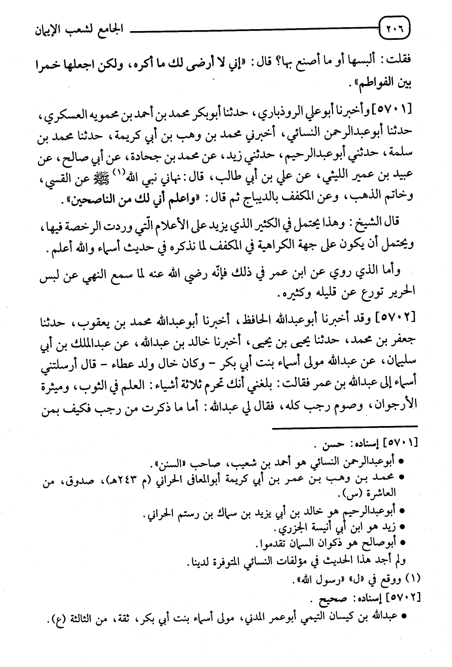 5701 - وَأَخْبَرَنَا أَبُو عَلِيٍّ الرُّوذْبَارِيُّ، ثَنَا أَبُو بَكْرٍ مُحَمَّدُ بْنُ أَحْمَدَ بْنِ مَحْمَوَيْهِ الْعَسْكَرِيُّ، ثَنَا أَبُو عَبْدِ الرَّحْمَنِ النَّسَائِيُّ، أَخْبَرَنِي مُحَمَّدُ بْنُ وَهْبِ بْنِ أَبِي كَرِيمَةَ، ثَنَا مُحَمَّدُ بْنُ سَلَمَةَ، حَدَّثَنِي أَبُو عَبْدِ الرَّحِيمِ، حَدَّثَنِي زَيْدٌ عَنْ مُحَمَّدِ بْنِ جُحَادَةَ، عَنْ أَبِي صَالِحٍ، عَنْ عُبَيْدِ بْنِ عُمَيْرٍ اللَّيْثِيِّ، عَنْ عَلِيِّ بْنِ أَبِي طَالِبٍ، قَالَ: نَهَانِي نَبِيُّ اللهِ صَلَّى اللَّهُ عَلَيْهِ وَسَلَّمَ §عَنِ الْقَسِّيِّ وَخَاتَمِ الذَّهَبِ وَعَنِ الْمُكَفَّفَ بِالدِّيبَاجِ، ثُمَّ قَالَ: " وَاعْلَمْ أَنِّي لَكَ مِنَ النَّاصِحِينَ " قَالَ الشَّيْخُ: " وَهَذَا يُحْتَمَلُ فِي الْكَثِيرِ الَّذِي يَزِيدُ عَلَى الْأَعْلَامِ الَّتِي وَرُدَّتِ الرُّخْصَةُ فِيهَا وَيُحْتَمَلُ أَنْ يَكُونَ عَلَى جِهَةِ الْكَرَاهِيَةِ فِي الْمُكَفَّفِ لَمَّا نَذْكُرُهُ فِي حَدِيثِ أَسْمَاءَ وَاللهُ أَعْلَمُ " وَأَمَّا الَّذِي رَوَى ابْنُ عُمَرَ فِي ذَلِكَ فَإِنَّهُ رَضِيَ اللهُ عَنْهُ لَمَّا سَمِعَ النَّهْيَ عَنْ لُبْسِ الْحَرِيرِ تَوَرَّعَ، عَنْ قَلِيلِهِ وَكَثِيرِهِ