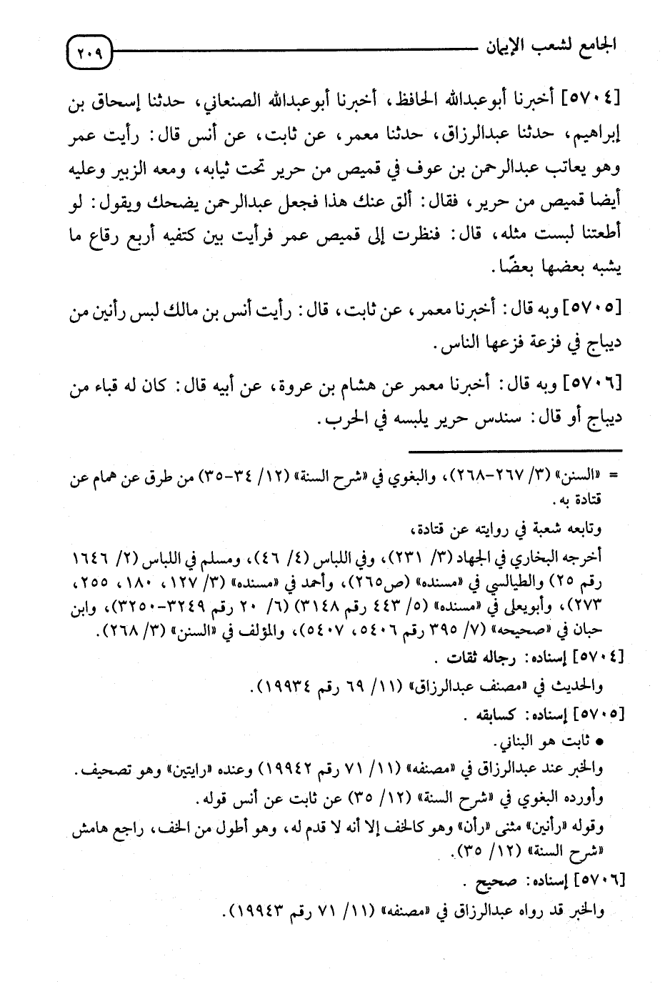 5704 - أَخْبَرَنَا أَبُو عَبْدِ اللهِ الْحَافِظُ، أَنَا أَبُو عَبْدِ اللهِ الصَّنْعَانِيُّ، ثَنَا إِسْحَاقُ بْنُ إِبْرَاهِيمَ، ثَنَا عَبْدُ الرَّزَّاقِ، أَنَا مَعْمَرٌ، عَنْ ثَابِتٍ، عَنْ أَنَسٍ قَالَ: رَأَيْتُ عُمَرَ وَهُوَ يُعَاتِبُ عَبْدَ الرَّحْمَنِ بْنَ عَوْفٍ فِي قَمِيصٍ مِنْ حَرِيرٍ تَحْتَ ثِيَابِهِ وَمَعَهُ الزُّبَيْرُ وَعَلَيْهِ أَيْضًا قَمِيصٌ مِنْ حَرِيرٍ فَقَالَ: أَلْقِ عَنْكَ هَذَا فَجَعَلَ عَبْدُ الرَّحْمَنِ يَضْحَكُ وَيَقُولُ: " §لَوْ أَطَعْتَنَا لَبِسْتَ مِثْلَهُ قَالَ: فَنَظَرْتُ إِلَى قَمِيصِ عُمَرَ فَرَأَيْتُ بَيْنَ كَتِفَيْهِ أَرْبَعَ رِقَاعٍ مَا يُشْبِهُ بَعْضُهَا بَعْضًا "