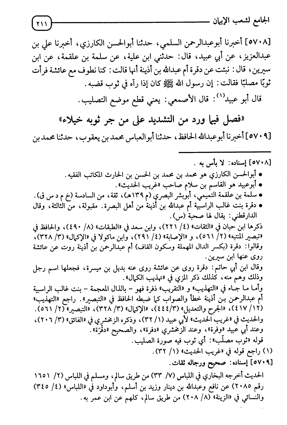 5708 - أَخْبَرَنَا أَبُو عَبْدِ الرَّحْمَنِ السُّلَمِيُّ، ثَنَا أَبُو الْحَسَنِ الْكَارِزِيُّ، أَنَا عَلِيُّ بْنُ عَبْدِ الْعَزِيزِ، عَنْ أَبِي عُبَيْدٍ قَالَ: حَدَّثَنِي ابْنُ عُلَيَّةَ، عَنْ سَلَمَةَ بْنِ عَلْقَمَةَ، عَنِ ابْنِ سِيرِينَ قَالَ: نُبِّئْتُ عَنْ دَفْرَةَ أُمِّ عَبْدِ اللهِ بْنِ أُذَيْنَةَ أَنَّهَا قَالَتْ: كُنَّا نَطُوفُ مَعَ عَائِشَةَ فَرَأَتْ ثَوْبًا مُصَلَّبًا فَقَالَتْ: " إِنَّ رَسُولَ اللهِ صَلَّى اللَّهُ عَلَيْهِ وَسَلَّمَ كَانَ §إِذَا رَآهُ فِي ثَوْبٍ قَضَبَهُ "