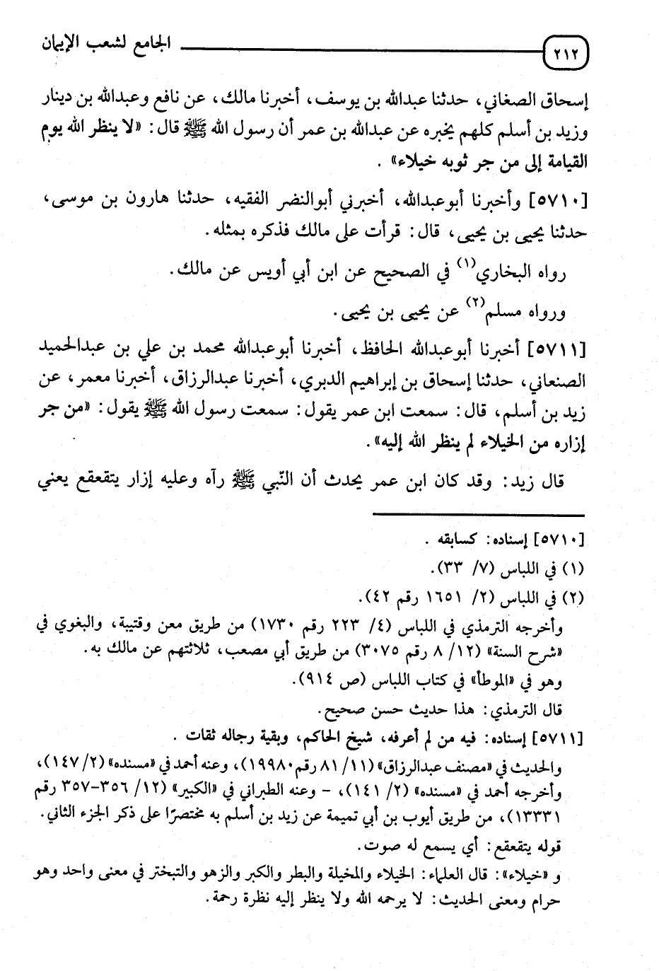 5711 - أَخْبَرَنَا أَبُو عَبْدِ اللهِ الْحَافِظُ، أَنَا أَبُو عَبْدِ اللهِ مُحَمَّدُ بْنُ عَلِيِّ بْنِ عَبْدِ الْحَمِيدِ الصَّنْعَانِيُّ ثَنَا إِسْحَاقُ بْنُ إِبْرَاهِيمَ الدَّبَرِيُّ، أَنَا عَبْدُ الرَّزَّاقِ، أَنَا مَعْمَرٌ، عَنْ يَزِيدَ بْنِ أَسْلَمَ قَالَ: سَمِعْتُ ابْنَ عُمَرَ يَقُولُ: سَمِعْتُ رَسُولَ اللهِ صَلَّى اللَّهُ عَلَيْهِ وَسَلَّمَ يَقُولُ: " مَنْ §جَرَّ إِزَارَهُ مِنَ الْخُيَلَاءِ لَمْ يَنْظُرِ اللهُ إِلَيْهِ " قَالَ زَيْدٌ