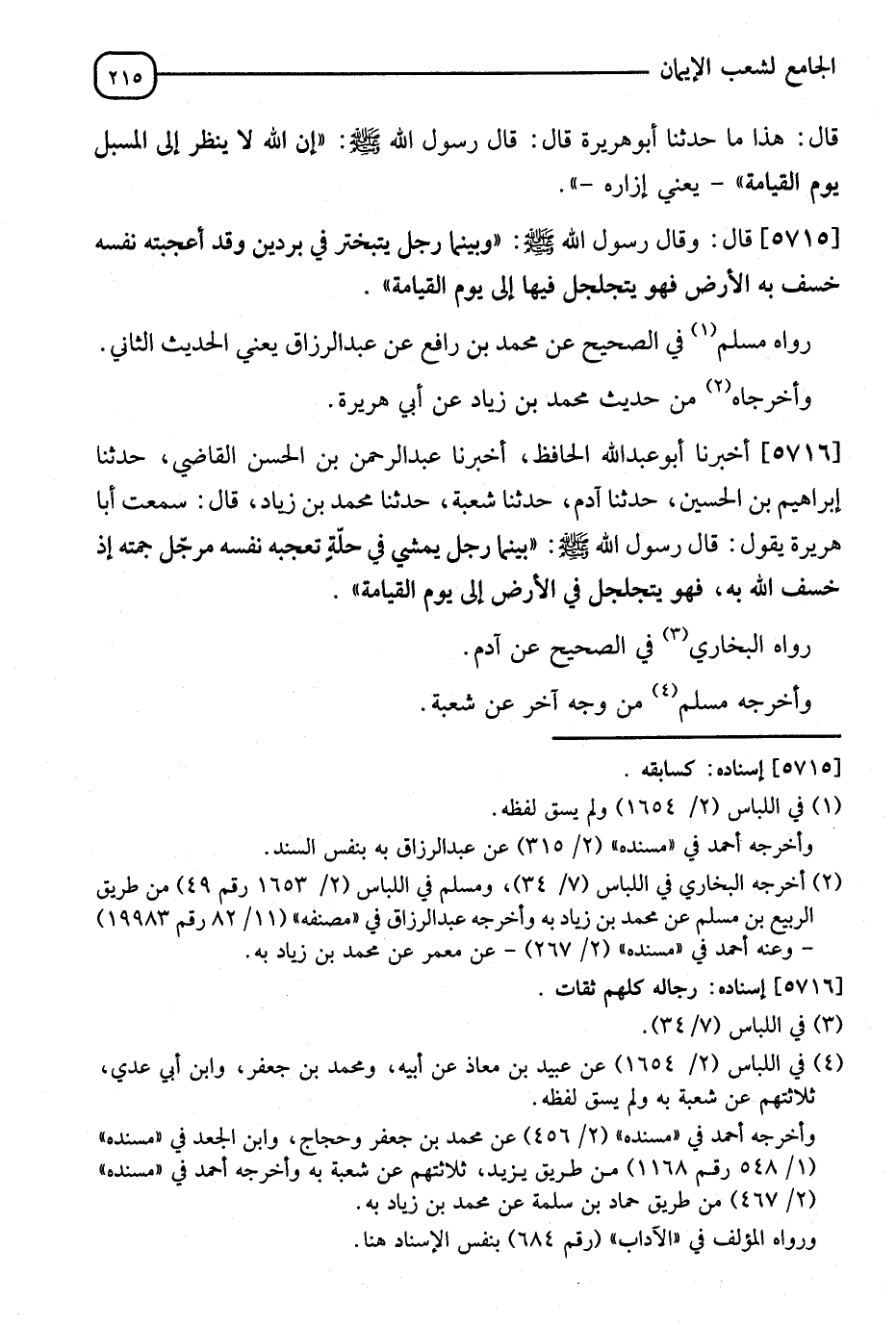 5716 - أَخْبَرَنَا أَبُو عَبْدِ اللهِ الْحَافِظُ، أَنَا عَبْدُ الرَّحْمَنِ بْنُ الْحَسَنِ الْقَاضِي، ثَنَا إِبْرَاهِيمُ بْنُ الْحُسَيْنِ، ثَنَا آدَمُ، ثَنَا شُعْبَةُ، ثَنَا مُحَمَّدُ بْنُ زِيَادٍ قَالَ: سَمِعْتُ أَبَا هُرَيْرَةَ يَقُولُ: قَالَ رَسُولُ اللهِ صَلَّى اللَّهُ عَلَيْهِ وَسَلَّمَ: §" بَيْنَمَا رَجُلٌ يَمْشِي فِي حُلَّةٍ تُعْجِبُهُ نَفْسُهُ مُرَجِّلٌ جُمَّتَهُ إِذْ خَسَفَ اللهُ بِهِ فَهُوَ يَتَجَلْجَلُ فِي الْأَرْضِ إِلَى يَوْمِ الْقِيَامَةِ رَوَاهُ الْبُخَارِيُّ فِي الصَّحِيحِ عَنْ آدَمَ وَأَخْرَجَهُ مُسْلِمٌ مِنْ وَجْهٍ آخَرَ عَنْ شُعْبَةَ
