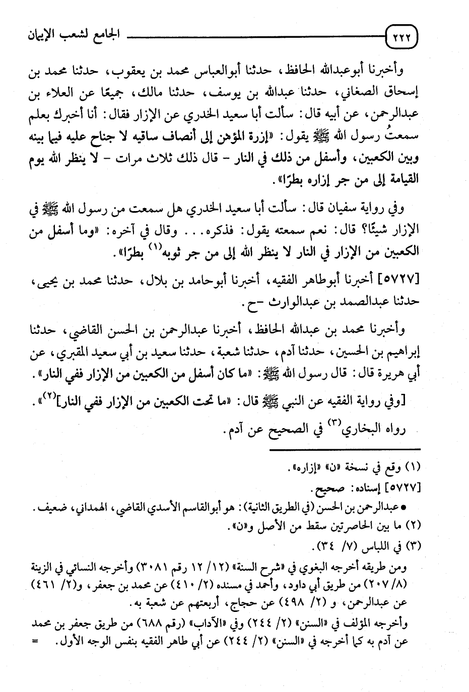 5727 - أَخْبَرَنَا أَبُو طَاهِرٍ الْفَقِيهُ، أَنَا أَبُو حَامِدِ بْنُ بِلَالٍ، ثَنَا مُحَمَّدُ بْنُ يَحْيَى، ثَنَا عَبْدُ الصَّمَدِ بْنُ عَبْدِ الْوَارِثِ، ح وَأَخْبَرَنَا مُحَمَّدُ بْنُ عَبْدِ اللهِ الْحَافِظُ، أَنَا عَبْدُ الرَّحْمَنِ بْنُ الْحَسَنِ الْقَاضِي، ثَنَا إِبْرَاهِيمُ بْنُ الْحُسَيْنِ، ثَنَا آدَمُ، أَنَا شُعْبَةُ، ثَنَا سَعِيدُ بْنُ أَبِي سَعِيدٍ الْمَقْبُرِيُّ، عَنْ أَبِي هُرَيْرَةَ قَالَ رَسُولُ اللهِ صَلَّى اللَّهُ عَلَيْهِ وَسَلَّمَ: §" مَا كَانَ أَسْفَلَ مِنَ الْكَعْبَيْنِ مِنَ الْإِزَارِ فِي النَّارِ " رَوَاهُ الْبُخَارِيُّ فِي الصَّحِيحِ عَنْ آدَمَ