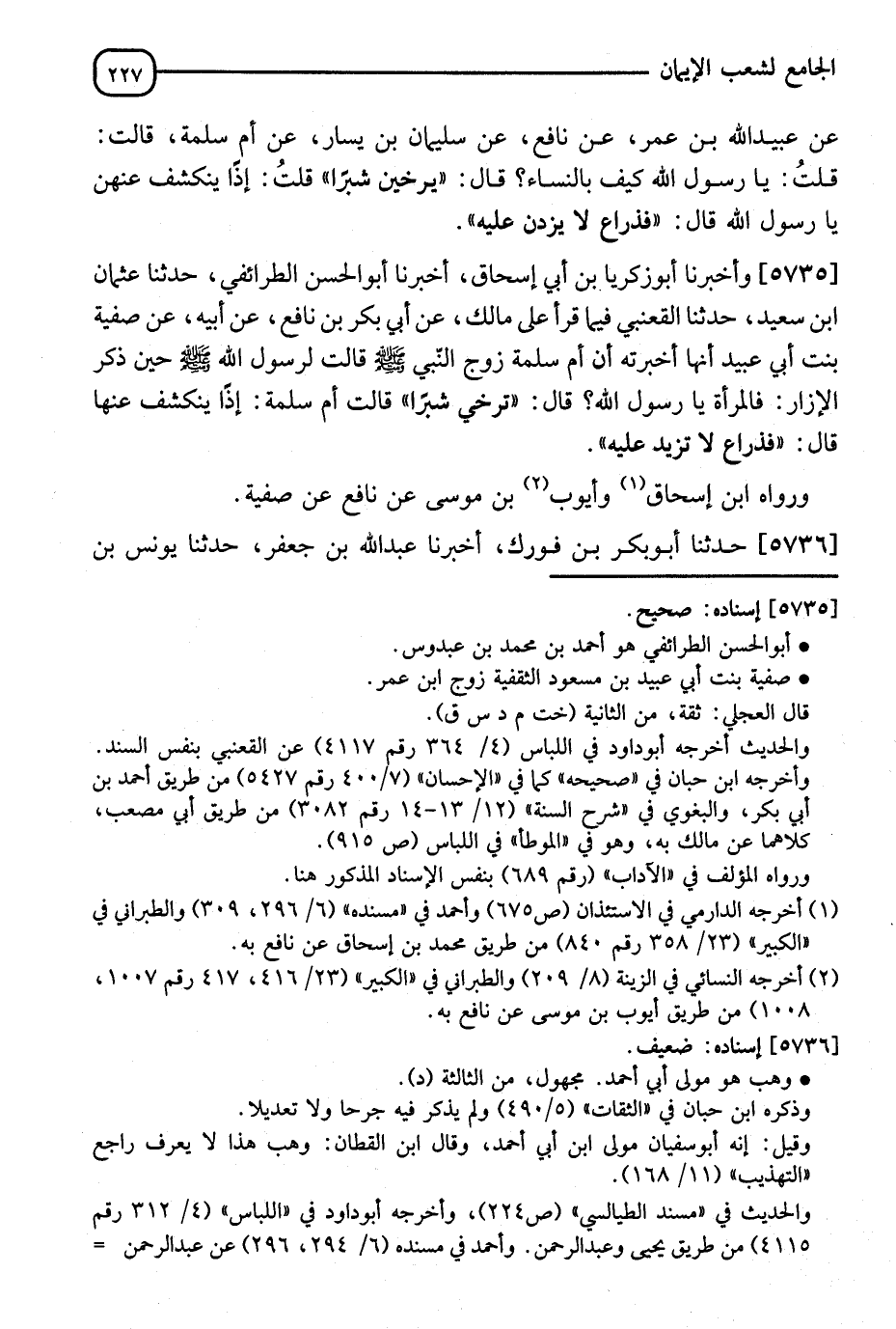 5735 - وَأَخْبَرَنَا أَبُو زَكَرِيَّا بْنُ أَبِي إِسْحَاقَ، أَنَا أَبُو الْحَسَنِ الطَّرَائِفِيُّ، ثَنَا عُثْمَانُ بْنُ سَعِيدٍ، ثَنَا الْقَعْنَبِيُّ، فِيمَا قَرَأَ عَلَى مَالِكٍ، عَنْ أَبِي بَكْرِ بْنِ نَافِعٍ، عَنْ أَبِيهِ، عَنْ صَفِيَّةَ بِنْتِ أَبِي عُبَيْدٍ، أَنَّهَا أَخْبَرَتْ أُمَّ سَلَمَةَ، زَوْجَ النَّبِيِّ صَلَّى اللَّهُ عَلَيْهِ وَسَلَّمَ قَالَتْ لِرَسُولُ اللهِ صَلَّى اللَّهُ عَلَيْهِ وَسَلَّمَ حِينَ ذَكَرَ الْإِزَارَ فَالْمَرْأَةُ يَا رَسُولَ اللهِ قَالَ: §" تُرْخِي شِبْرًا " قَالَتْ أُمُّ سَلَمَةَ إِذًا يَنْكَشِفُ عَنْهَا قَالَ: " فَذِرَاعٌ لَا يَزِيدُ عَلَيْهِ " وَرَوَاهُ ابْنُ إِسْحَاقَ وَأَيُّوبُ بْنُ مُوسَى، عَنْ نَافِعٍ، عَنْ صَفِيَّةَ