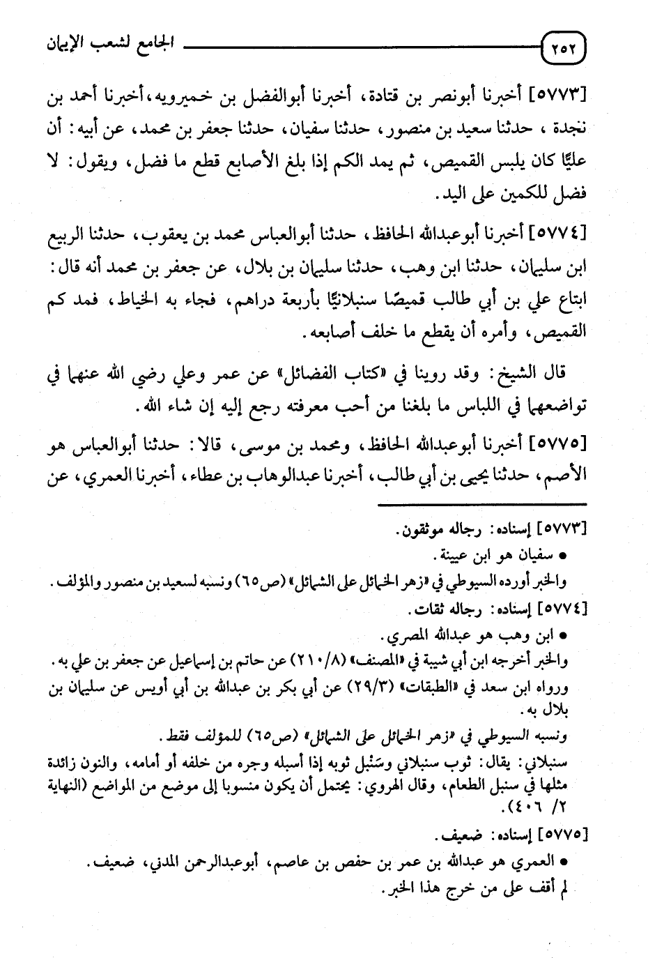 5773 - أَخْبَرَنَا أَبُو نَصْرِ بْنُ قَتَادَةَ، أَنَا أَبُو الْفَضْلِ بْنُ خَمْيَرَوَيْهِ، أَنَا أَحْمَدُ بْنُ نَجْدَةَ، ثَنَا سَعِيدُ بْنُ مَنْصُورٍ، ثَنَا سُفْيَانُ، ثَنَا جَعْفَرُ بْنُ مُحَمَّدٍ، عَنْ أَبِيهِ، أَنَّ عَلِيًّا كَانَ يَلْبَسُ الْقَمِيصَ ثُمَّ يَمُدُّ الْكُمَّ حَتَّى إِذَا بَلَغَ الْأَصَابِعَ قَطَعَ مَا فَضَلَ وَيَقُولُ: §" لَا فَضْلَ لِلْكُمَّيْنِ عَلَى الْيَدِ "