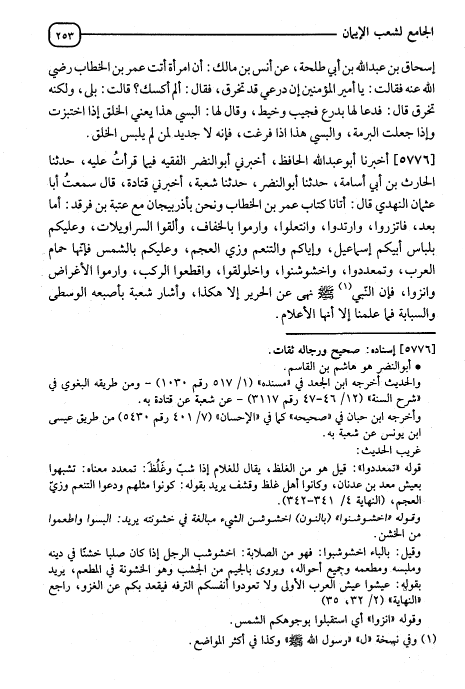 5776 - أَخْبَرَنَا أَبُو عَبْدِ اللهِ الْحَافِظُ، أَخْبَرَنِي أَبُو النَّضْرِ الْفَقِيهُ، فِيمَا قَرَأْتُ عَلَيْهِ ثَنَا الْحَارِثُ بْنُ أَبِي أُسَامَةَ، ثَنَا أَبُو النَّضْرِ، ثَنَا شُعْبَةُ، أَخْبَرَنِي قَتَادَةُ قَالَ: سَمِعْتُ أَبَا عُثْمَانَ النَّهْدِيَّ قَالَ: أَتَانَا كِتَابُ عُمَرَ بْنِ الْخَطَّابِ وَنَحْنُ بِأَذْرَبِيجَانَ مَعَ عُتْبَةَ بْنِ فَرْقَدٍ، أَمَّا بَعْدُ فَاتَّزِرُوا وَارْتَدُوا وَانْتَعِلُوا وَارْمُوا بِالْخِفَافِ، وَأُلْقُوا السَّرَاوِيلَاتِ وَعَلَيْكُمْ بِلِبَاسِ أَبِيكُمْ إِسْمَاعِيلَ، وَإِيَّاكُمْ وَالتَّنَعُّمَ وَزِيَّ الْعَجَمِ، وَعَلَيْكُمْ بِالشَّمْسِ فَإِنَّهَا حَمَّامُ الْعَرَبِ وَتَمَعْدَدُوا وَاخْشَوْشِنُوا وَاخْلَوْلَقُوا وَاقْطَعُوا الرُّكَبَ وَارْمُوا الْأَعْرَاضَ وَابْذُوا فَإِنَّ رَسُولَ اللهِ صَلَّى اللَّهُ عَلَيْهِ وَسَلَّمَ §" نَهَى عَنِ الْحَرِيرِ إِلَّا هَكَذَا " وَأَشَارَ شُعْبَةُ بِإِصْبَعِهِ الْوُسْطَى وَالسَّبَّابَةِ فَمَا عَلِمْنَا إِلَّا أَنَّهَا الْأَعْلَامُ