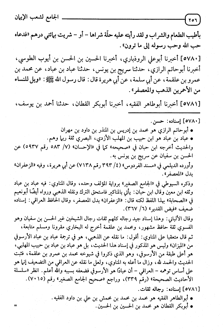 5780 - أَخْبَرَنَا أَبُو عَلِيٍّ الرُّوذْبَارِيُّ، أَنَا الْحُسَيْنُ بْنُ الْحَسَنِ بْنِ أَيُّوبَ الطُّوسِيُّ، أَنَا أَبُو حَاتِمٍ الرَّازِيُّ، ثَنَا شُرَيْحُ بْنُ يُونُسَ، ثَنَا عَبَّادُ بْنُ عَبَّادٍ، عَنْ مُحَمَّدِ بْنِ عَمْرِو بْنِ عَلْقَمَةَ، عَنْ أَبِي سَلَمَةَ، عَنْ أَبِي هُرَيْرَةَ قَالَ: قَالَ رَسُولُ اللهِ صَلَّى اللَّهُ عَلَيْهِ وَسَلَّمَ: §" وَيْلٌ لِلنِّسَاءِ مِنَ الْأَحْمَرَيْنِ الذَّهَبِ وَالْمُعَصْفَرِ "