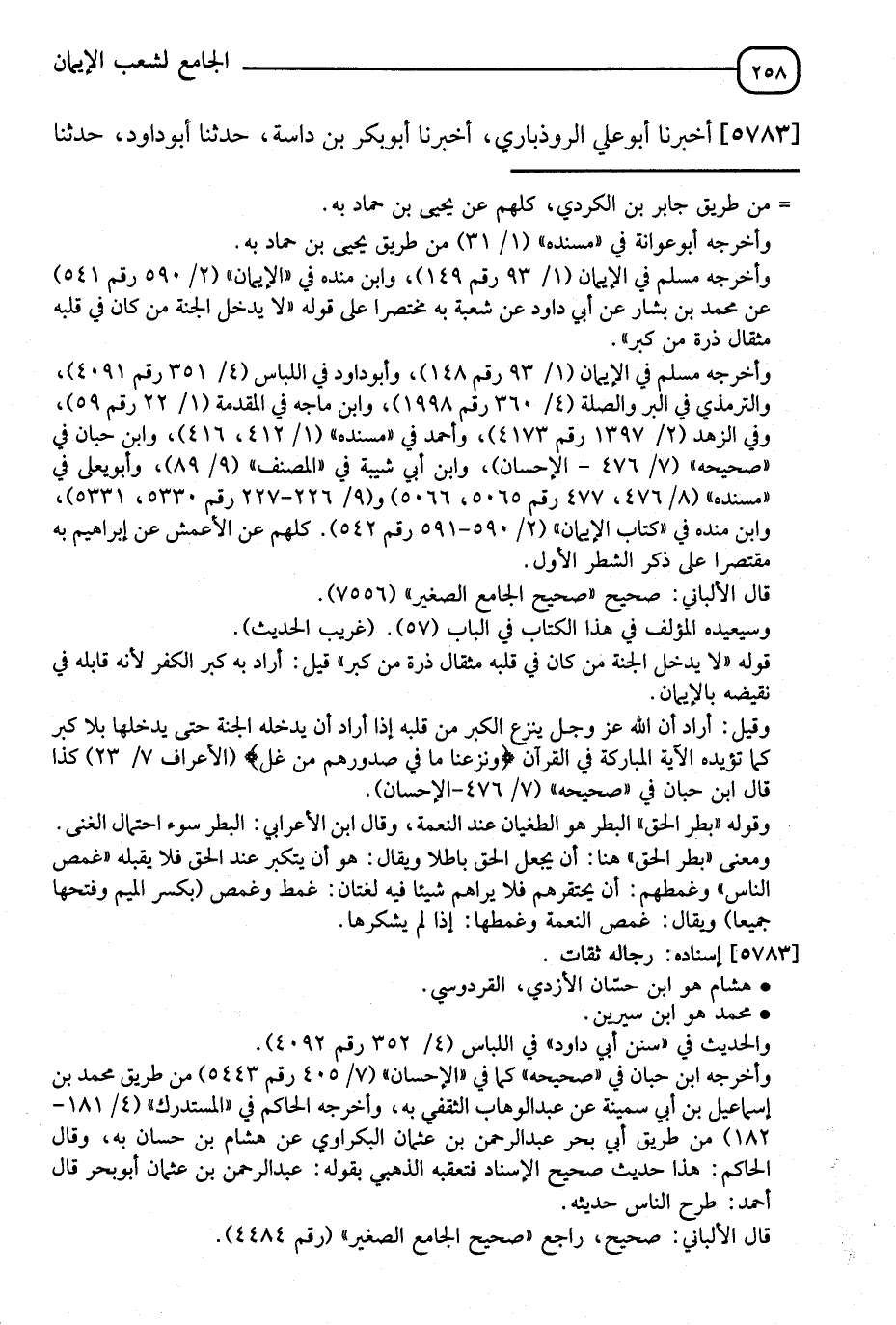5783 - أَخْبَرَنَا أَبُو عَلِيٍّ الرُّوذْبَارِيُّ، أَنَا أَبُو بَكْرِ بْنُ دَاسَةَ، ثَنَا أَبُو دَاوُدَ، ثَنَا -[259]- مُحَمَّدُ بْنُ الْمُثَنَّى أَبُو مُوسَى، ثَنَا عَبْدُ الْوَهَّابِ، ثَنَا هِشَامٌ، عَنْ مُحَمَّدٍ، عَنْ أَبِي هُرَيْرَةَ، أَنَّ رَجُلًا أَتَى النَّبِيَّ صَلَّى اللَّهُ عَلَيْهِ وَسَلَّمَ وَكَانَ رَجُلًا جَمِيلًا، فَقَالَ: يَا رَسُولَ اللهِ إِنِّي رَجُلٌ حُبِّبَ إِلَيَّ الْجَمَالُ، وَأُعْطِيتُ مِنْهُ مَا تَرَى حَتَّى إِنِّي مَا أُحِبُّ أَنْ يَفُوقَنِي أَحَدٌ إِمَّا قَالَ: " §بِشِرَاكِ نَعْلِي وَإِمَّا، قَالَ: بِشِسْعِ نَعْلِي أَفَمَنِ الْكِبْرِ ذَلِكَ؟ قَالَ: لَا وَلَكِنَّ الْكِبْرَ مَنْ بَطَرَ الْحَقَّ وَغَمَطَ النَّاسَ "