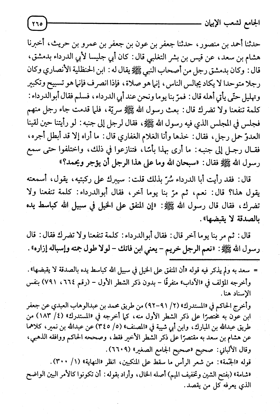 ثُمَّ مَرَّ بِنَا يَوْمًا آخَرَ، فَقَالَ أَبُو الدَّرْدَاءِ: كَلِمَةٌ تَنْفَعُنَا وَلَا تَضُرَّكَ فَقَالَ: قَالَ رَسُولُ اللهِ صَلَّى اللَّهُ عَلَيْهِ وَسَلَّمَ: " إِنَّ §الْمُنْفِقَ عَلَى الْخَيْلِ فِي سَبِيلِ اللهِ كَبَاسِطِ يَدِهِ بِالصَّدَقَةِ لَا يَقْبِضُهَا "